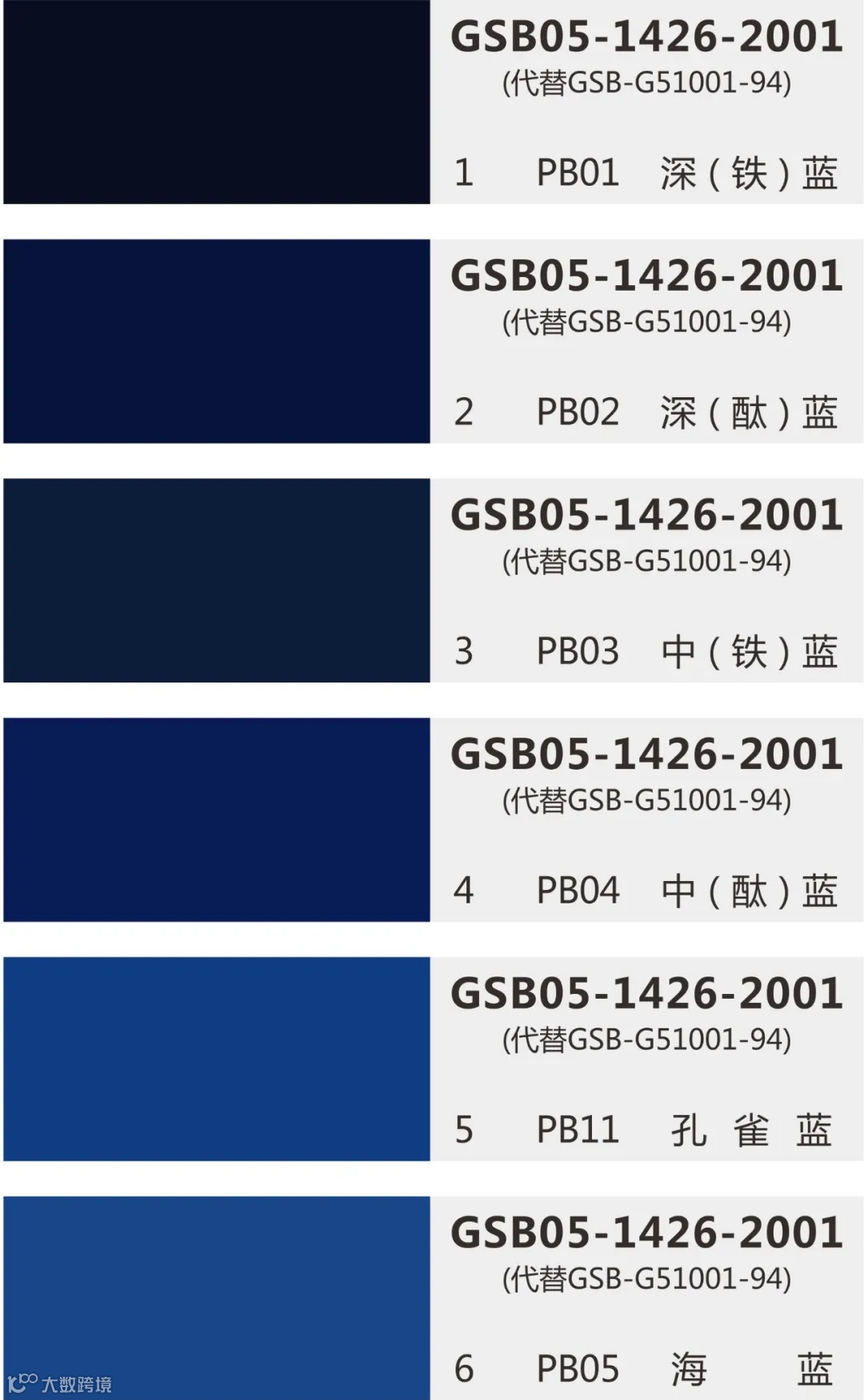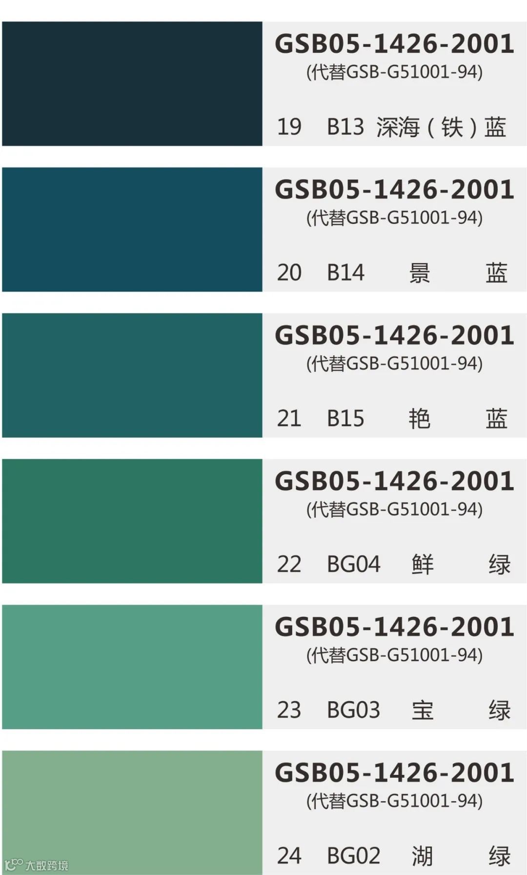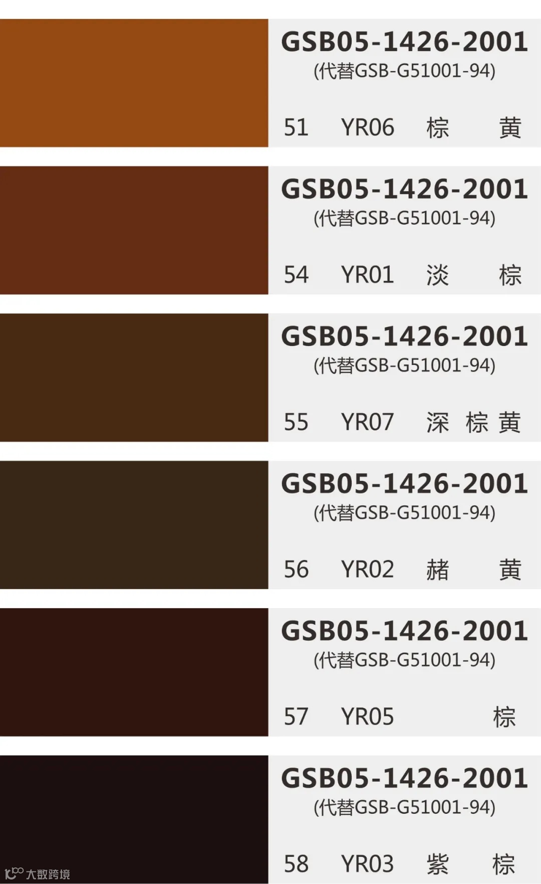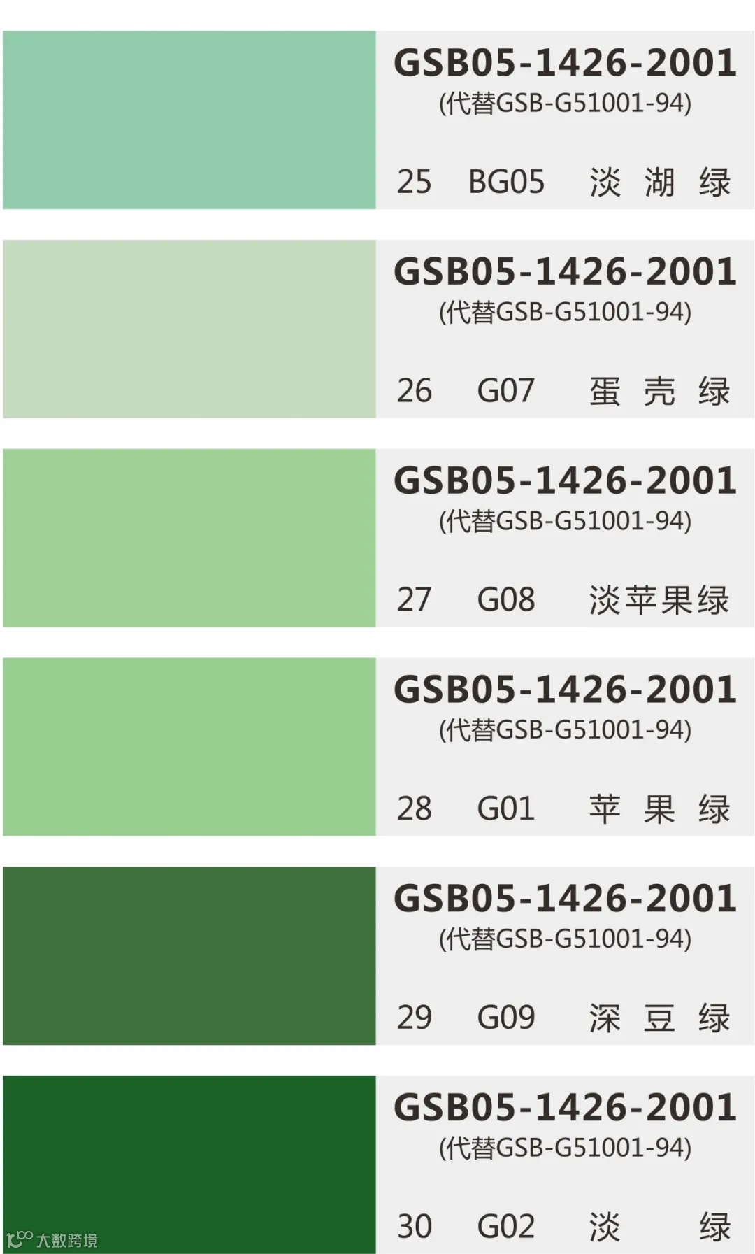GSB05-1426-2001 (代替GSB G51001-94) 是全国涂料和颜料标准化委员会根据国家标准GB3181制作的实物标准色卡,在涂料、油漆、颜料、塑胶、金属涂装,等各行业均被广泛采用。含83种颜色,光面效果。每个颜色都有国家统一标准的编号,适用于油性涂料方面使用。
