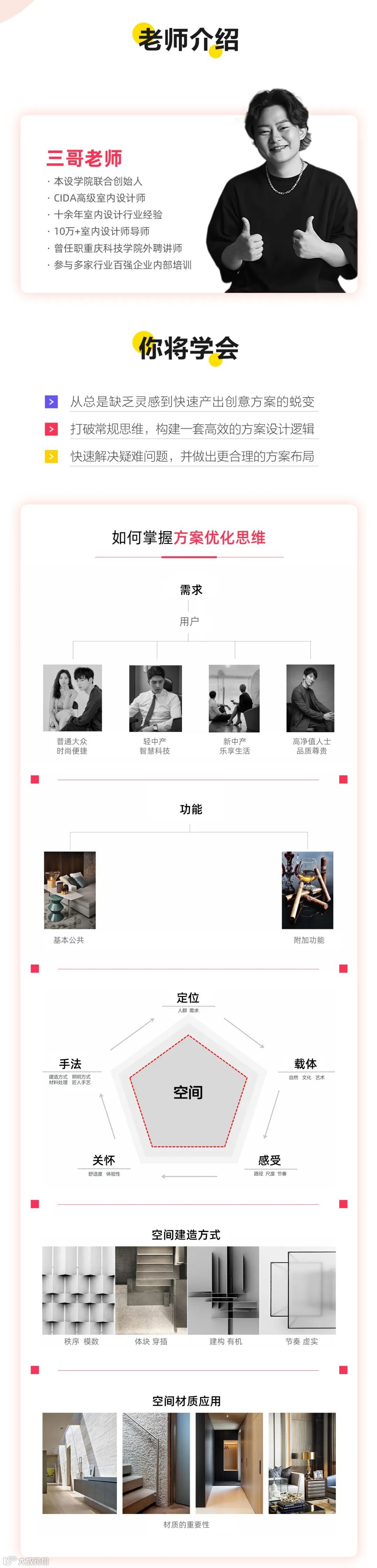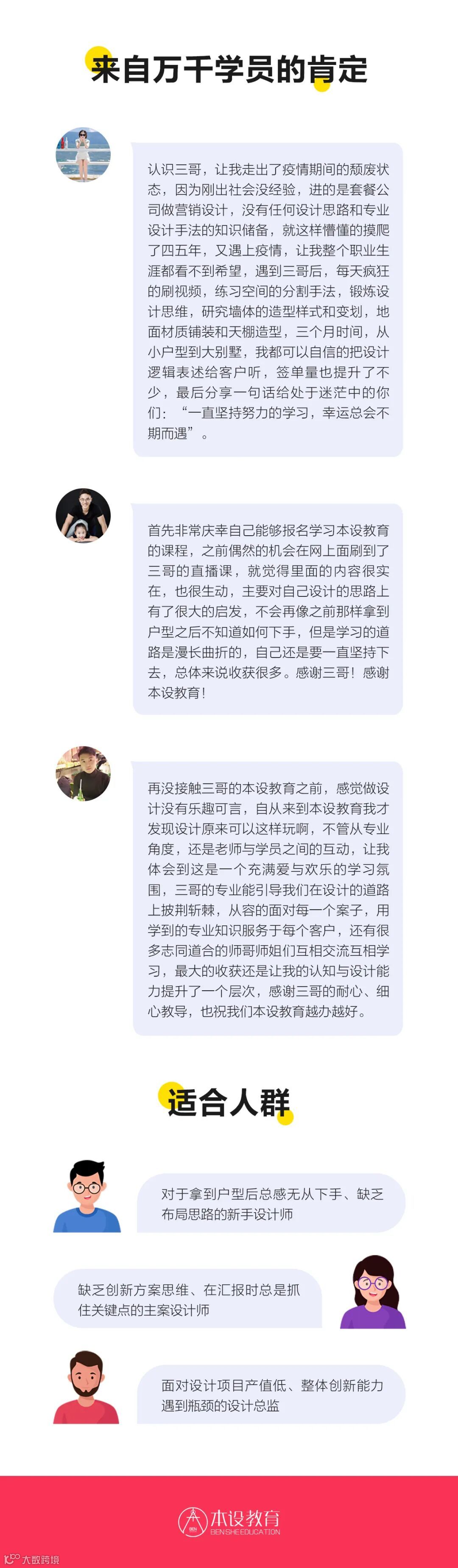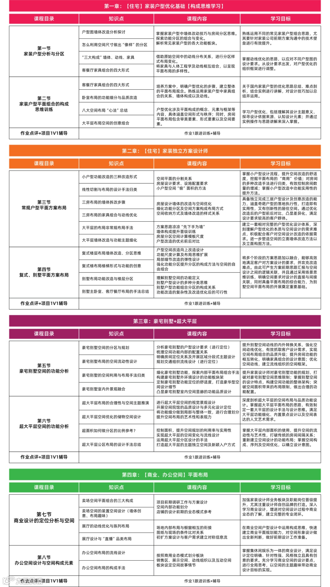 学习过程中出现的难点以及知识点道化,均由主讲老师在"学习群"一对一解答;课程内容进行“覆盖式”总结学员的学习不足之处并做出相应诊断,对墙体改造、家具布局、动线优化三大布局核心做出归类;尤其针对户型分析、设计要求细化确立布局设计目标;做到设计立意创新、思路多元化提升。涵盖空间构成场景的方法补充学习、设计思维辑推理、空间墙体推演建模以及案例讲评;采用独立社群“签到"式跟进;开展"小灶课"补充更多知识要点,每次答疑均采用视频录制方式存档