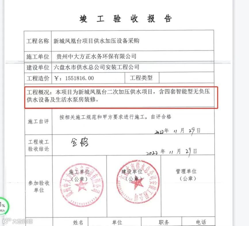 验收当天,按照验收流程,验收组人员现场查看了设施设备,仔细做好登记,并就工程质量、工程技术标准等方面展开充分讨论,最终一致同意通过新城·六盘水凤凰台项目二次供水加压设备设施通过验收,并出具竣工验收报告。
