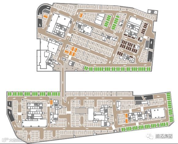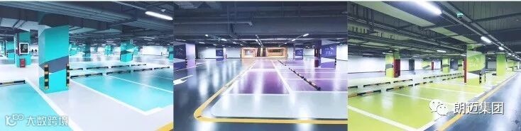 朗迈深圳方大城项目以色彩区分通用车位(灰色)、电车车位(绿色)、残疾人车位(橙色)