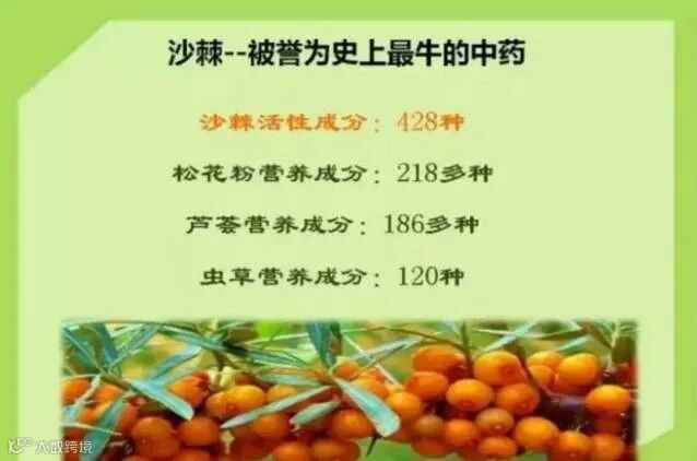 沙棘中含有400多种对人体有益的活性物质,其中有46种生物活性物质,含有大量的维生素E、维生素A、黄酮等,具有抗疲劳和增强机体活力及抗癌等特殊药理性能,具有保护和加速修复胃黏膜、增加肠道双歧杆菌的药性,有降减血浆胆固醇、减少血管壁中胆固醇含量的作用,能防治高血脂症和动脉粥样硬化症,并有促进伤口愈合的作用。
