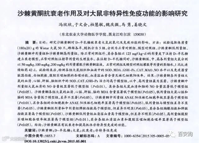 东北农业大学动物医学学院的沙棘黄酮抗衰老作用及对大鼠非特异性免疫功能的影响研究,实验结束后,检测各组大鼠的组织和血液中的SOD,MDA,GSH-PX,CAT,MAO,NO水平及免疫器官器脏指数,白细胞数等,得出结论:沙棘具有抗氧化作用,在增强机体免疫力和机体非特异性免疫功能。