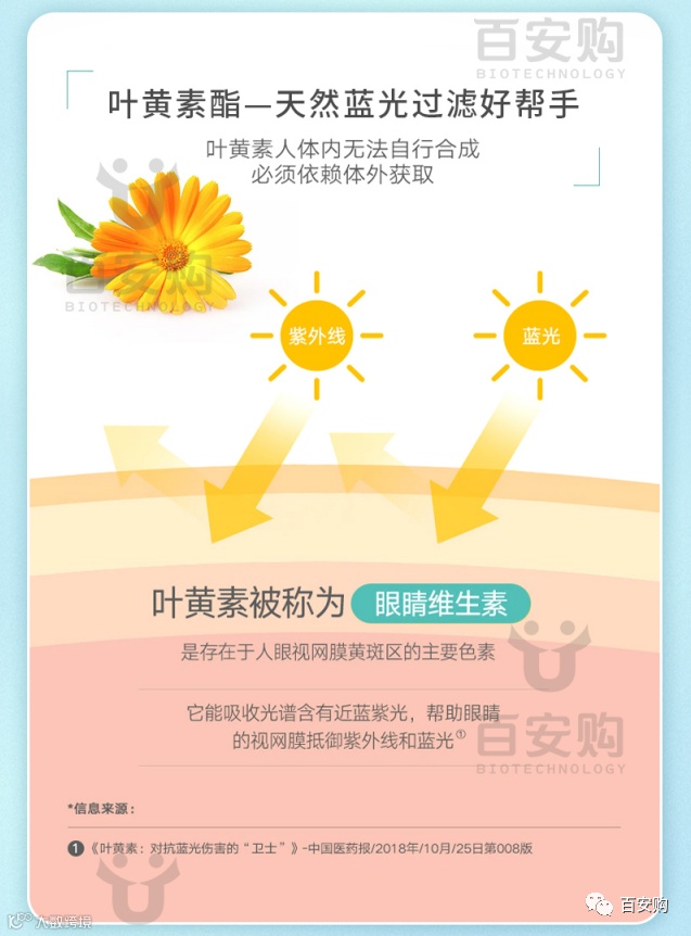 从天然万寿菊提取的叶黄素酯,可在人眼视网膜内部形成一种有效的蓝光过滤器,帮助视网膜抵御紫外线和蓝光。叶黄素酯对视网膜中的黄斑有重要的保护作用,缺乏时易引发黄斑退化和视物模糊。叶黄素人体内无法自行合成,必须从外界获取。