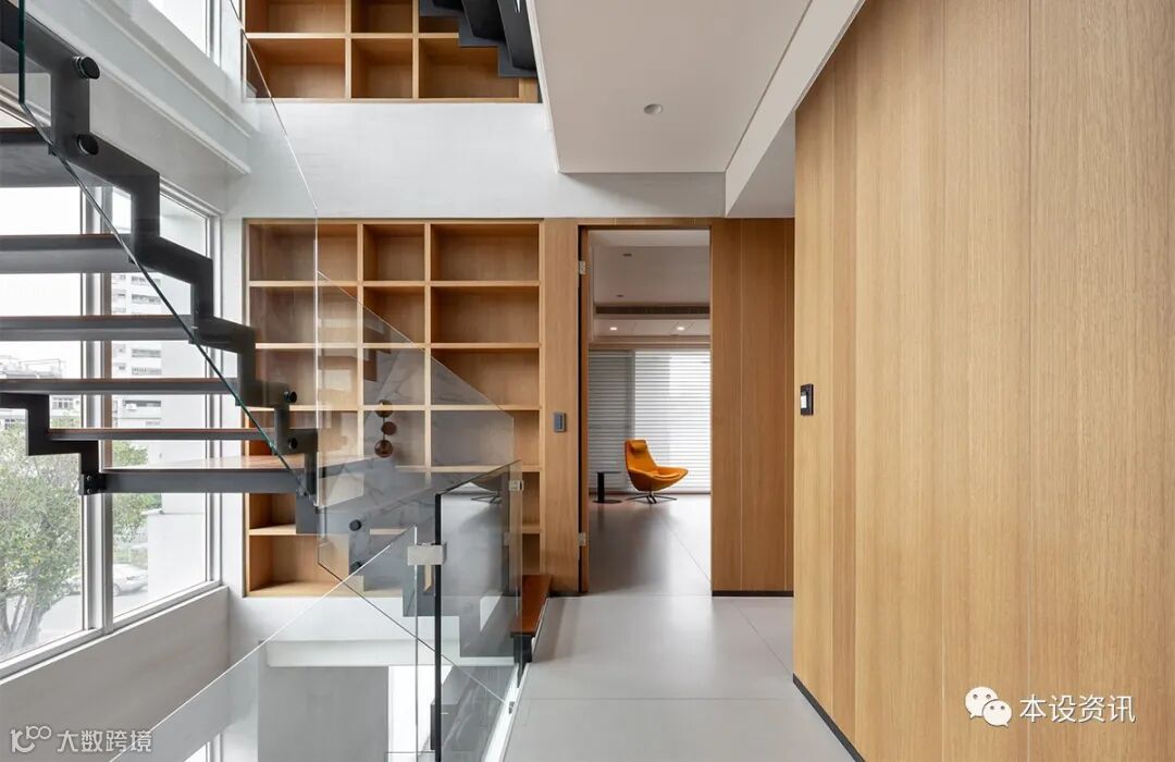 拾级而上,妥善运用介于楼板之间的凹洞间隙,砌就一道开放木格柜填满空白,交予每层楼的主人陈列摆设,无论相册、书籍或是旅行纪念品,彰显自成一格的独到品味。