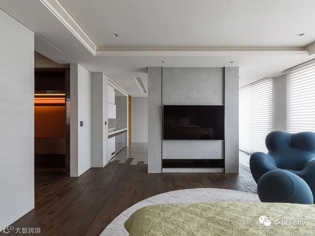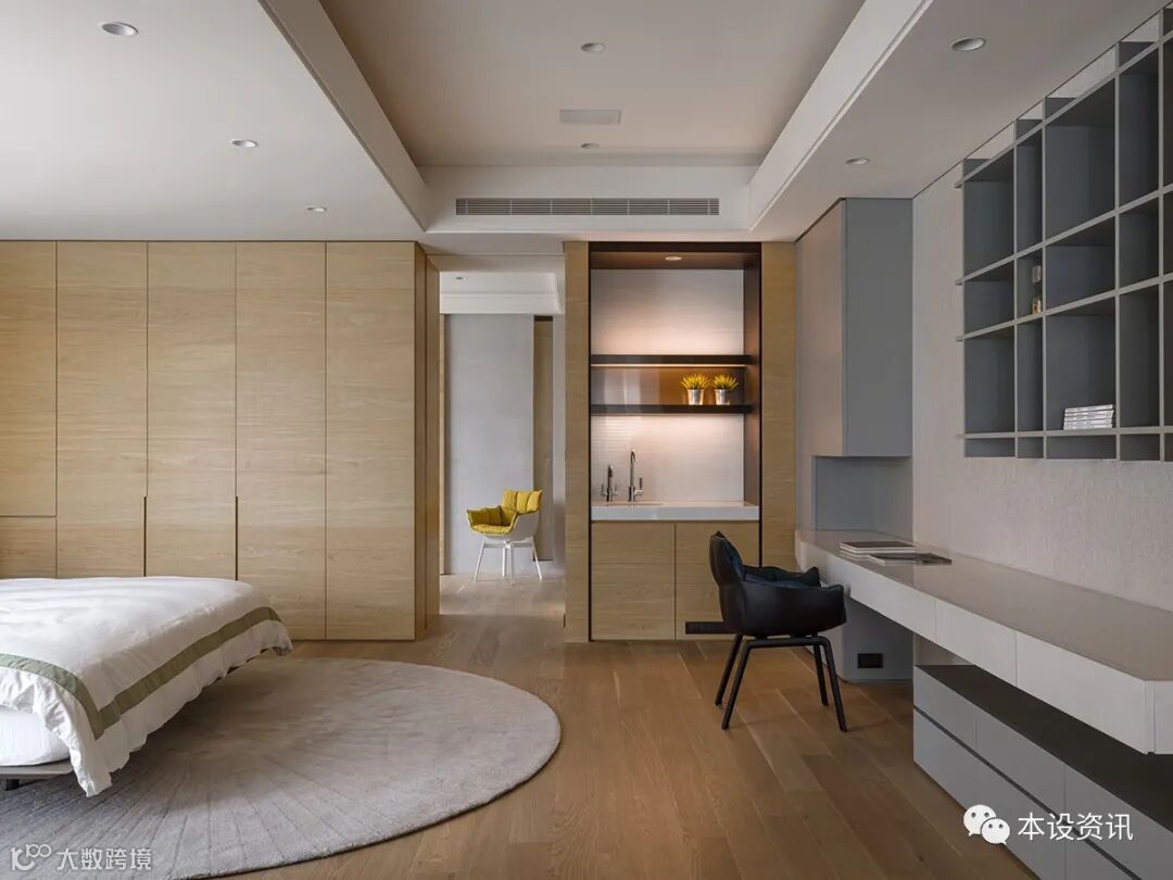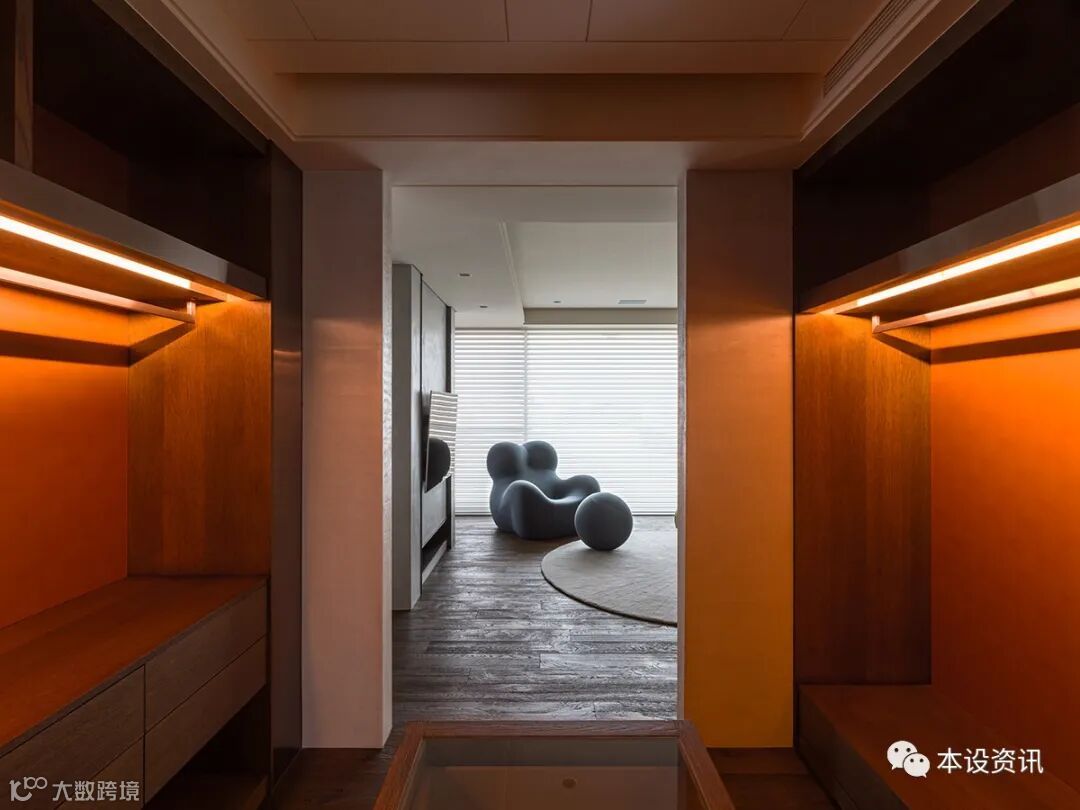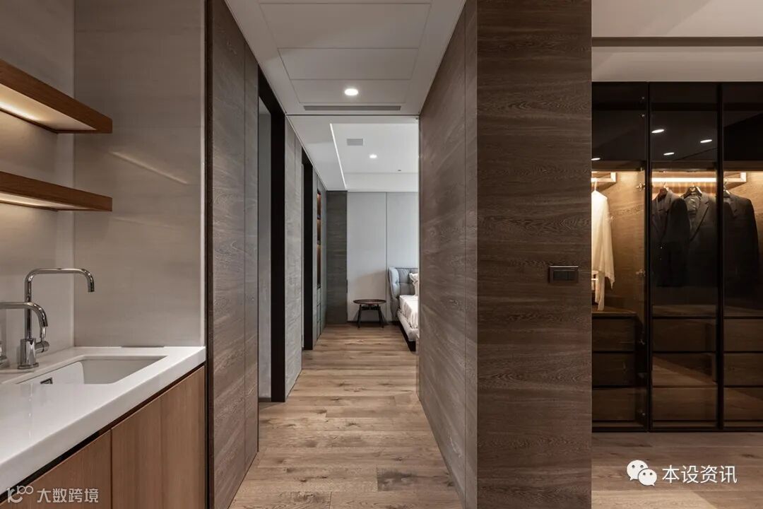 A recessive sliding door becomes an ambiguous medium, combing the vein by the mountain texture of chicken wing wood, following the smooth integration of the walkway into the locker room, and covering the wardrobe facade with tea glass transparent sight, so that the field is separated from each other. In addition, in view of their past experience of living through the weather, they often have to go up and down to drink water, so they knead the tea cabinets along the corridor, and prepare hot and cold pipes in advance, so that there is no need to turn around to fetch water.