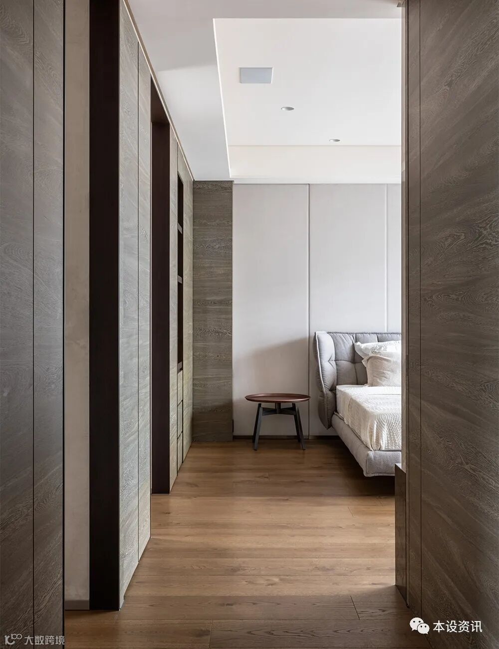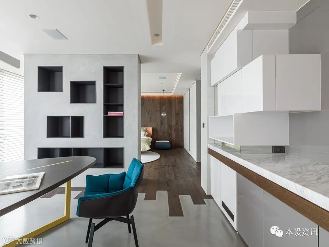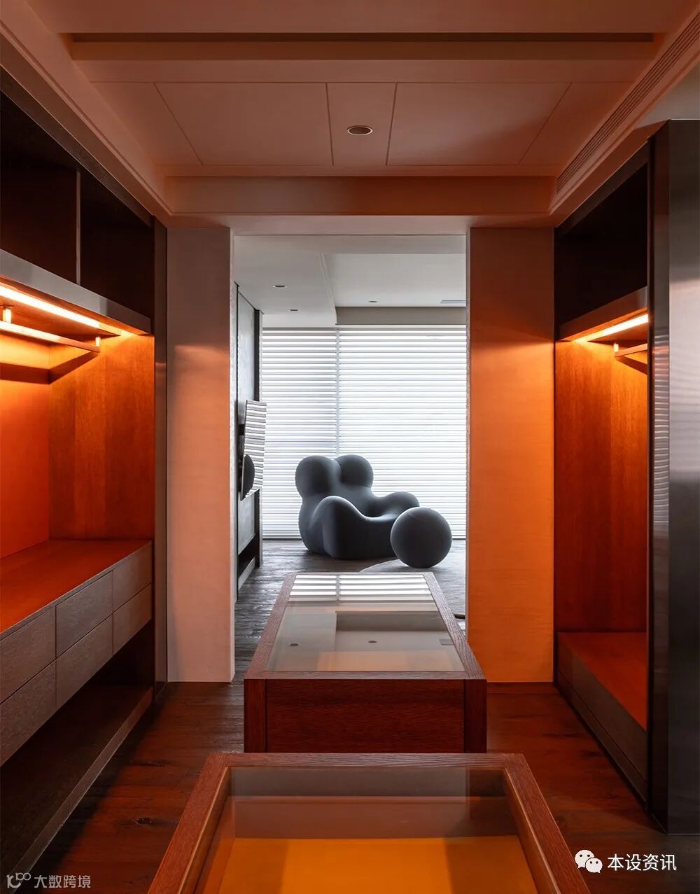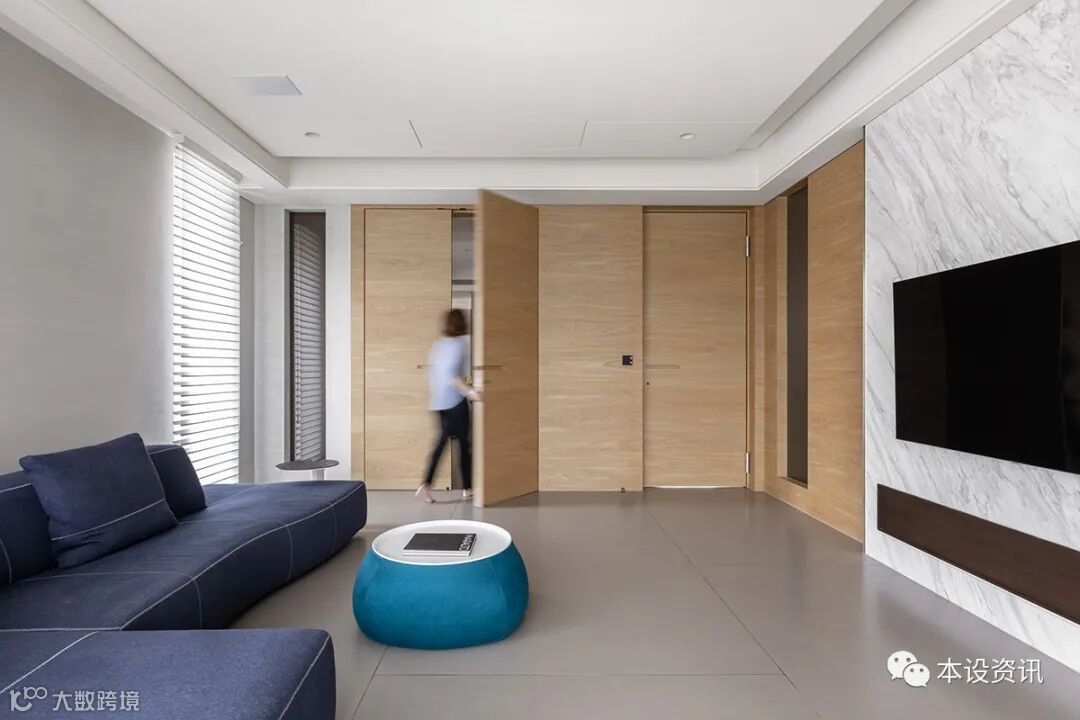 A recessive sliding door becomes an ambiguous medium, combing the vein by the mountain texture of chicken wing wood, following the smooth integration of the walkway into the locker room, and covering the wardrobe facade with tea glass transparent sight, so that the field is separated from each other. In addition, in view of their past experience of living through the weather, they often have to go up and down to drink water, so they knead the tea cabinets along the corridor, and prepare hot and cold pipes in advance, so that there is no need to turn around to fetch water.