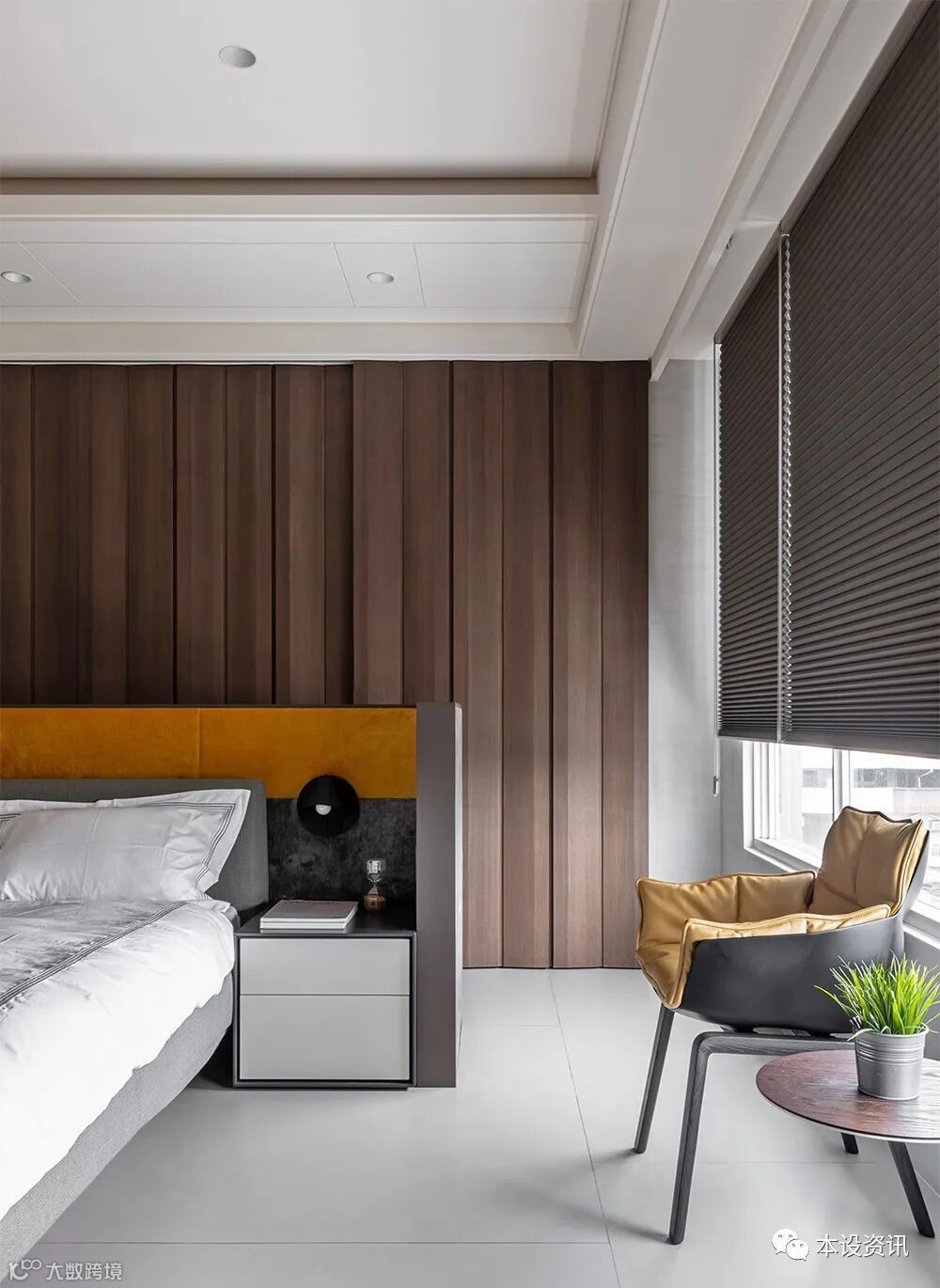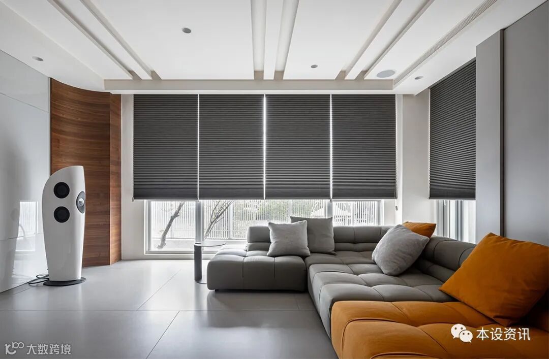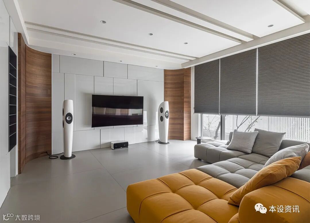 At the same time, the facade and ceiling are filled with linear language, presenting a spontaneous atmosphere in an orderly rhythm. The back wall is wrapped in delicate leather, supporting the concealed electric box with vertical lines, and the gray sofa mixed with warm yellow, balancing the cold and warm tone, and surrounding a warm and pleasant situation.
