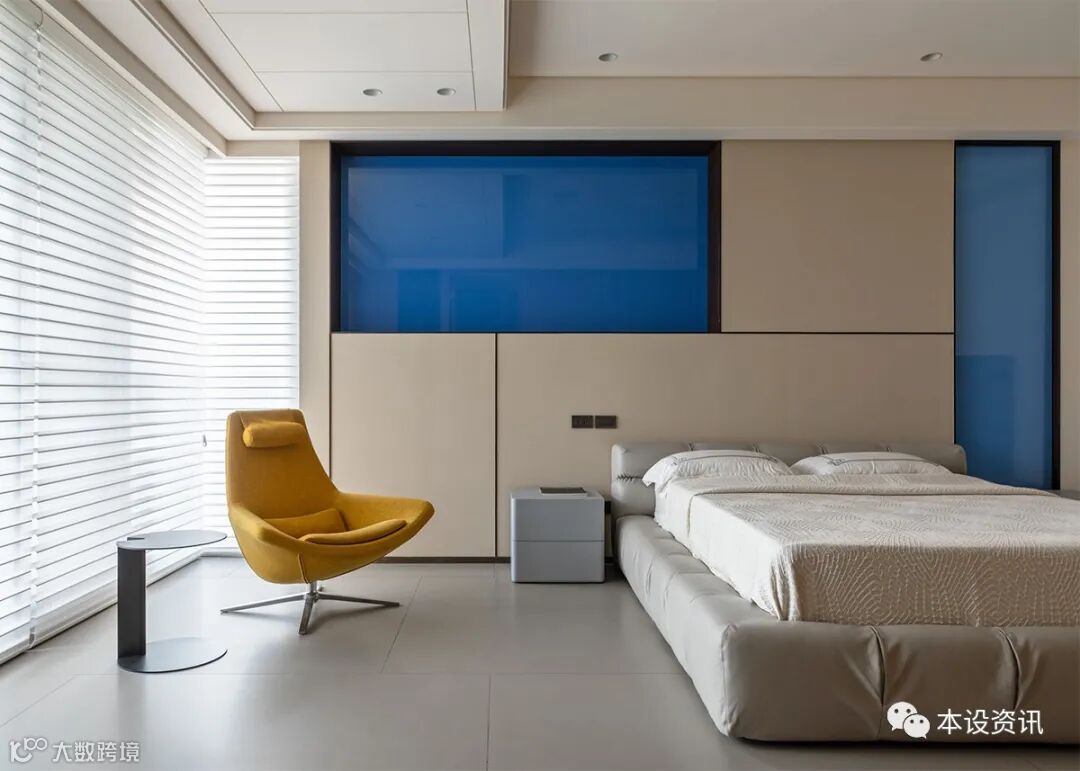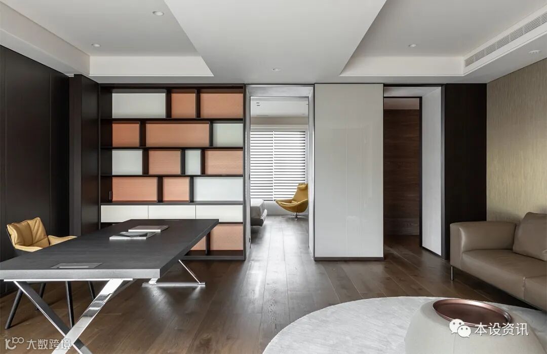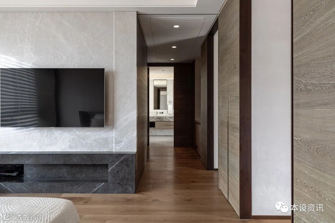 A line of separation, in the bucket frame distinguish field attributes, deliberately expanded width to form a two-way cabinet, so that the storage function of the hidden boundary, but also a corridor through the study, bedroom and locker room, with sliding door to adjust the degree of privacy, outline the moving line relationship. In view of the master bedroom planning, the head of the bed wall is inlaid with stretched cloth to soften the facade expression, reflecting the diffuse natural taste of marble texture, so that the sleeping time is quiet without disturbance.