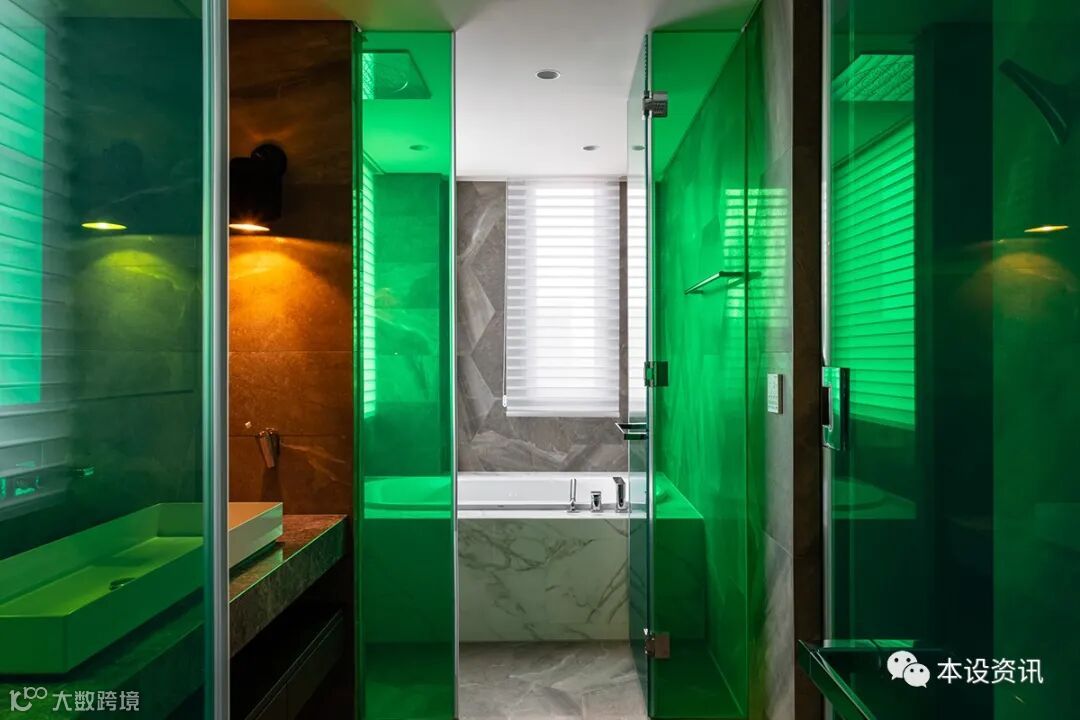 走进浴室的刹那间,从暖橘红顷刻换上晶透绿玻璃,一派朦胧的迷幻气息顷刻瀰漫,配上大尺度石纹六角砖,使卫浴体现独有美学格调。