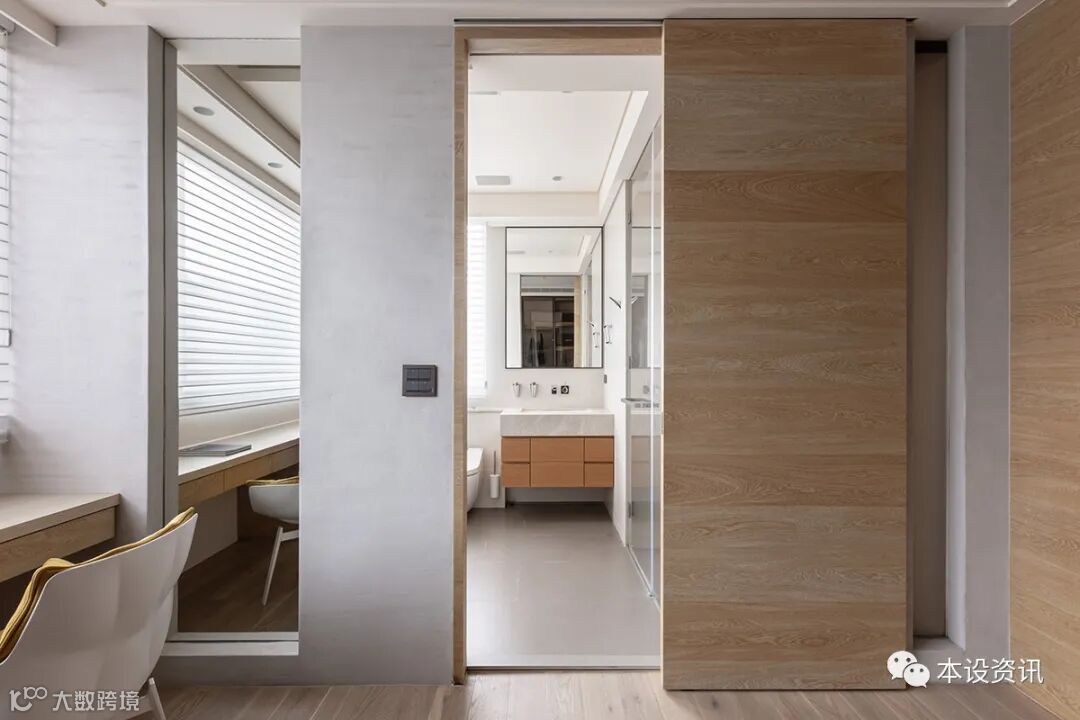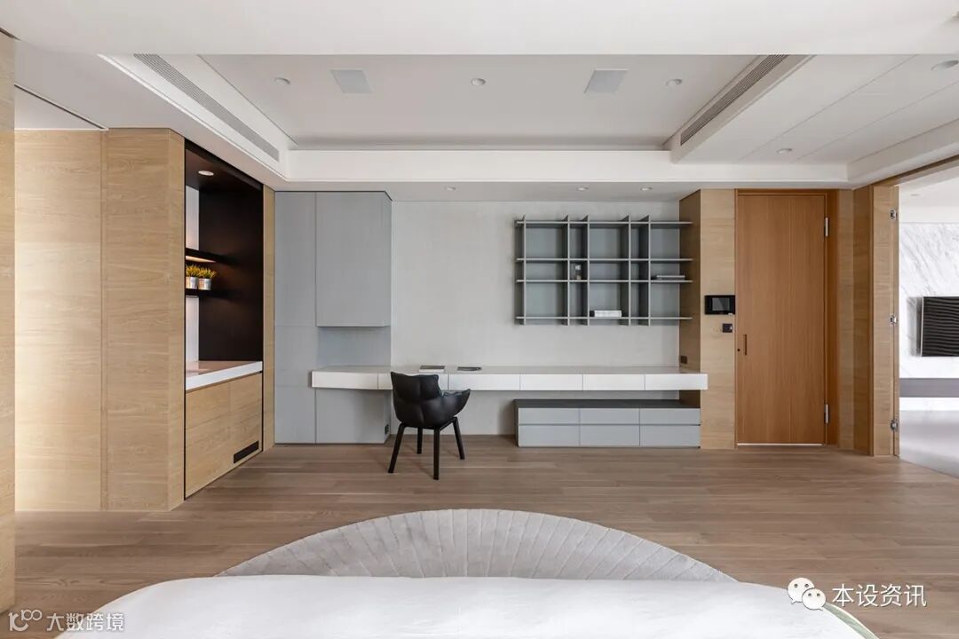 同步挹注浅橡木调和氛围,使休憩与办公取得恰好平衡,相继砌筑茶水柜与衣柜柔性划分更衣室,方便取水,也能使常态衣物好收易拿;循序迈进,将更衣室切分成二,使男女主人的衣物各据一方,互不影响。