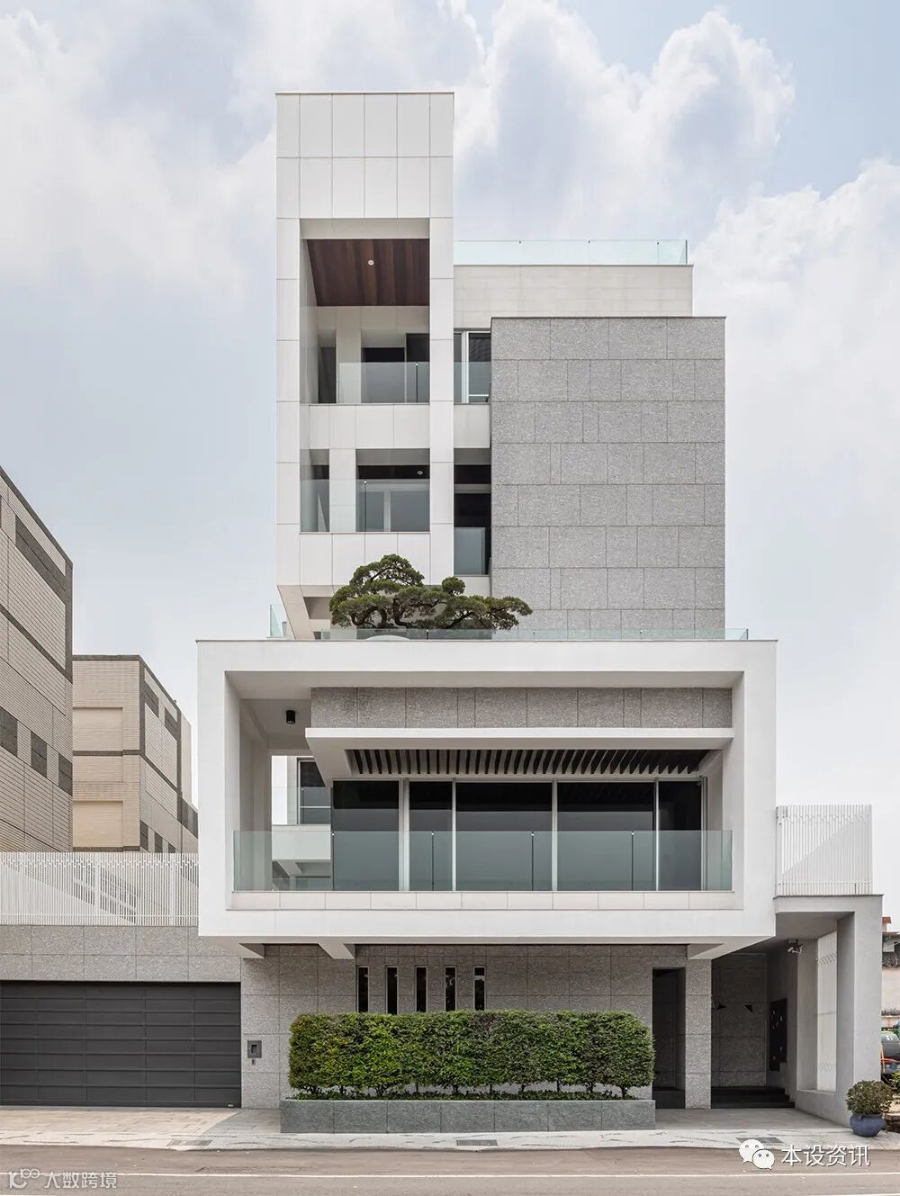 依序闢一方活水池当作暧昧介质,以波光涟漪模糊自然与建筑的分际,接著于立面裹上白橡与磁砖大板,任凭温润脉络冉冉升腾,伴著日光空气氤氲一缕天然气息。