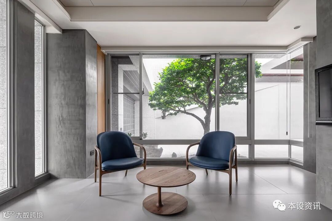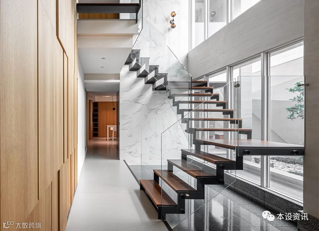 一道迴廊牵起水平向度、一座梯井贯串垂直轴线,以层递手法佈局空间关係,并承袭外观的质朴灰调,将特殊涂料以手刮细腻呈现,少了锋利边缘、多了温和气息。