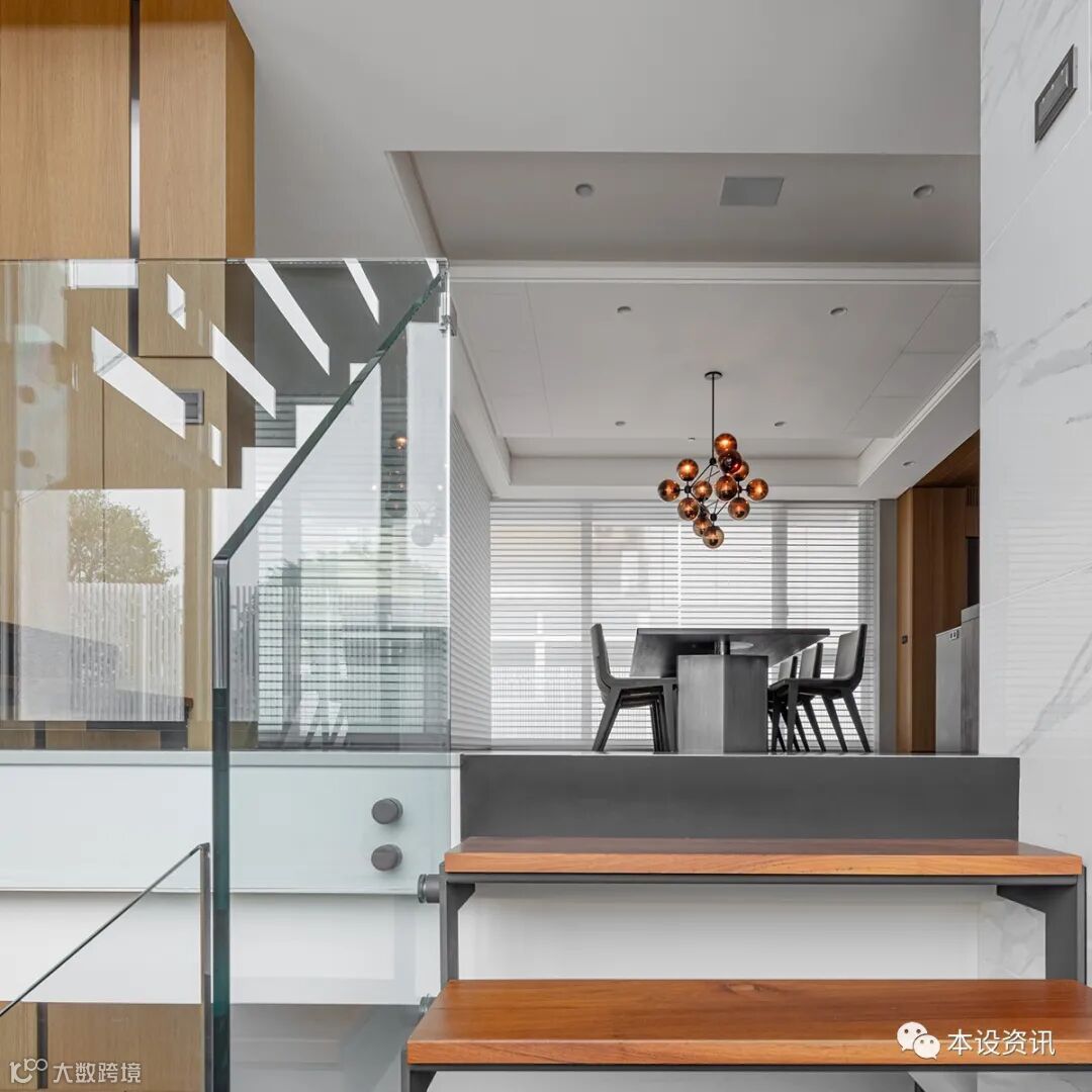 同步採用缅甸柚木当作楼梯踏板,凭藉原生本质杜绝虫蛀,随著时间慢慢酿造温醇原木韵味,搭配 2 公分强化玻璃扶手,製造独有轻稳视感,当家人归返时,即能循序沉淀心境,感受渐至佳境的轻快节奏。
