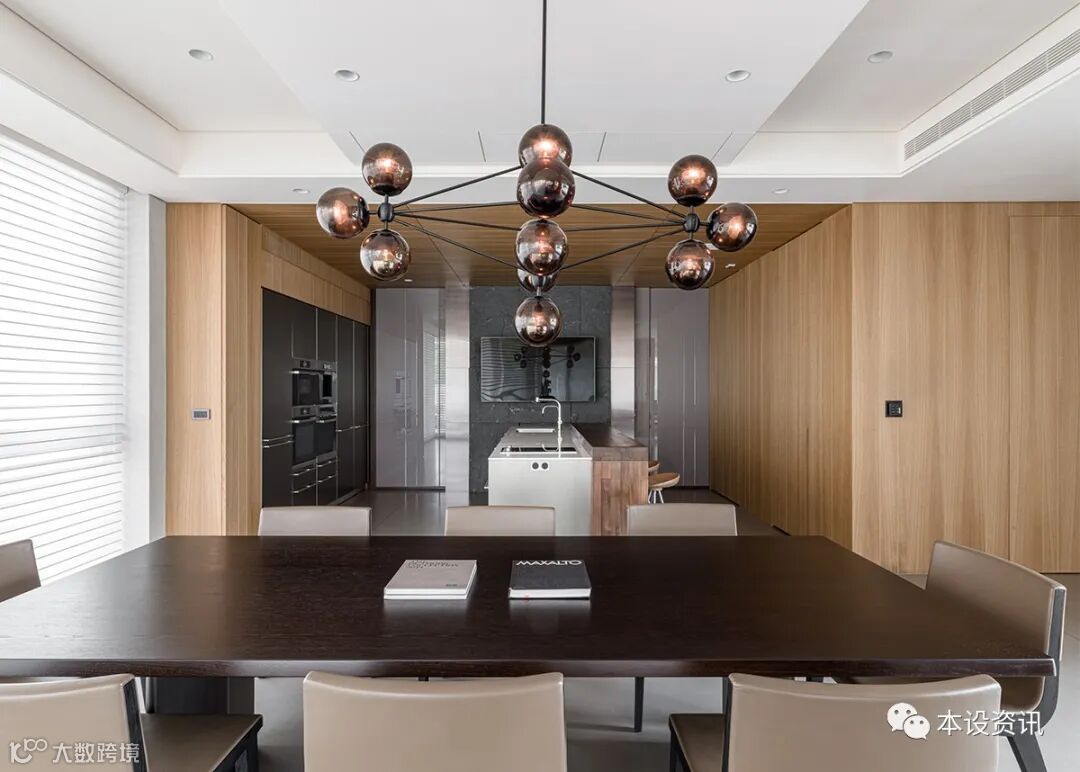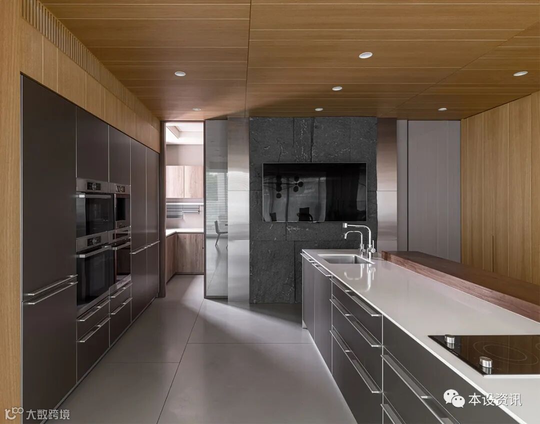 Opposite to each other, the hidden door is used to reduce the complex lines, so that the storage cabinet and wine cabinet are hidden invisible, synchronous with the rough stone precipitation atmosphere in the central axis. The two sides are respectively covered with titanium metal, and a pair of glass sliding doors are symmetrically configured, so that the hot cooking area and the guest toilet fade into a pure.