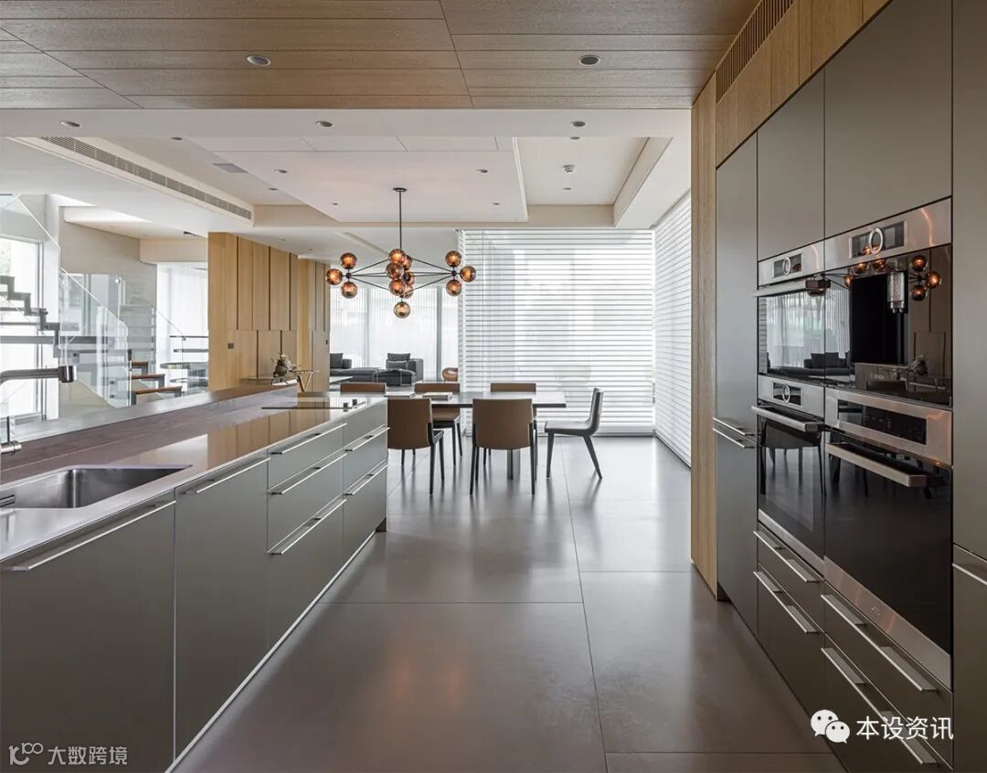 A middle island bar, suitable for the morning light food time, with imported kitchen utensils from Germany Bulthaup, with champagne gold aluminum alloy inlaid design to achieve a restrained scene.