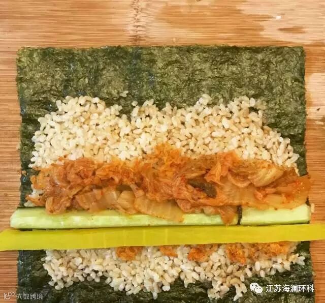 做法:1.将米饭均匀铺在紫菜上,压实,放上切好的黄瓜胡萝卜条、香肠、芝士、肉松,卷起来切好,微波大火三分钟,ok!