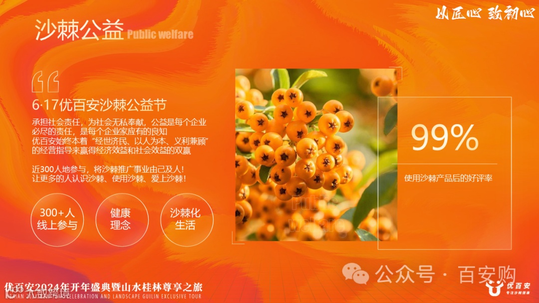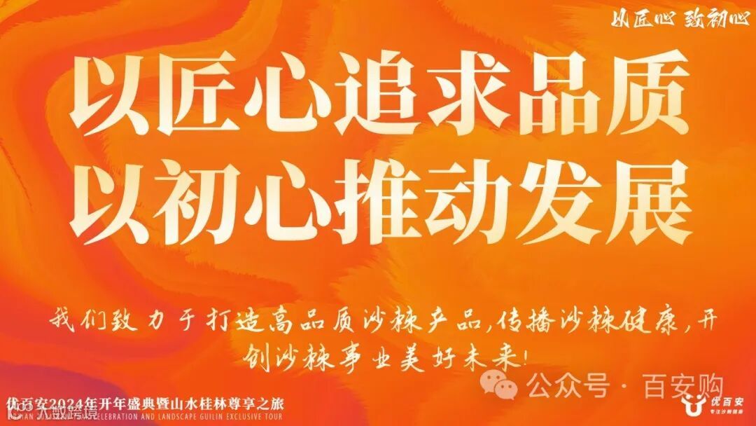 年会虽然已经结束了,但是我们的沙棘事业未曾结束,大家的热情也未曾减退!在沙棘的这项事业中,我们每个人都肩负着伟大而神圣的使命,而优百安会伴随着大家共同进退,让更多的人受益于沙棘,让更多的人加入到优百安的大家庭中!我们为此将竭尽全力!“雄关漫道真如铁,而今迈步从头越”!