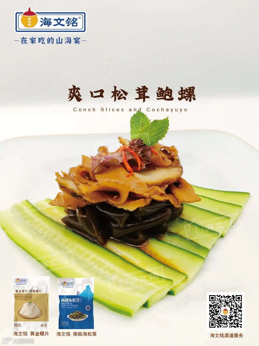产品特点:源自非洲无污染海域的螺片搭配源自南极纯净水域的海松茸,两种爽脆交织,风味爽口独特。