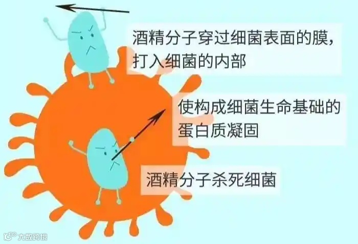 其实,酒精之所以能够达到消毒的效果主要是因为它能够吸收细菌蛋白的水分,使其脱水变性凝固,从而达到消灭病毒的目的。