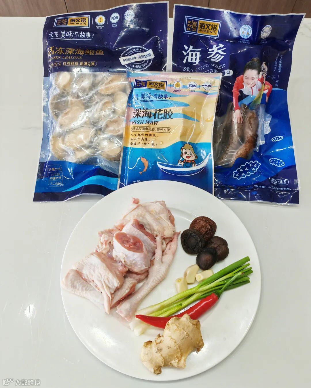 海文铭活冻深海鲍鱼、欧洲海参、深海花胶化冰后洗净备用;三黄鸡洗净切块备用;