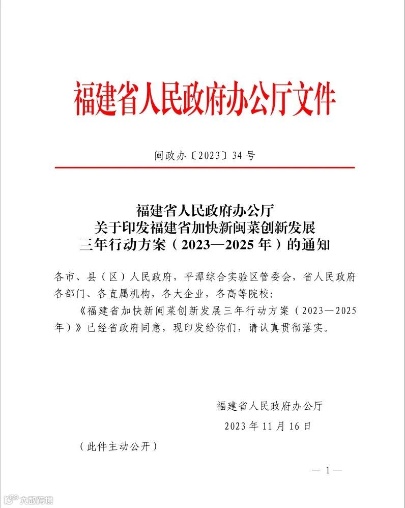 为全面落实国家关于恢复和扩大消费的决策部署,进一步扩大新闽菜影响,持续提升新闽菜形象,把新闽菜产业打造成优势特色富民产业,近日,福建省人民政府办公厅印发了《福建省加快新闽菜创新发展三年行动方案(2023—2025年)》(以下简称:“方案”)。