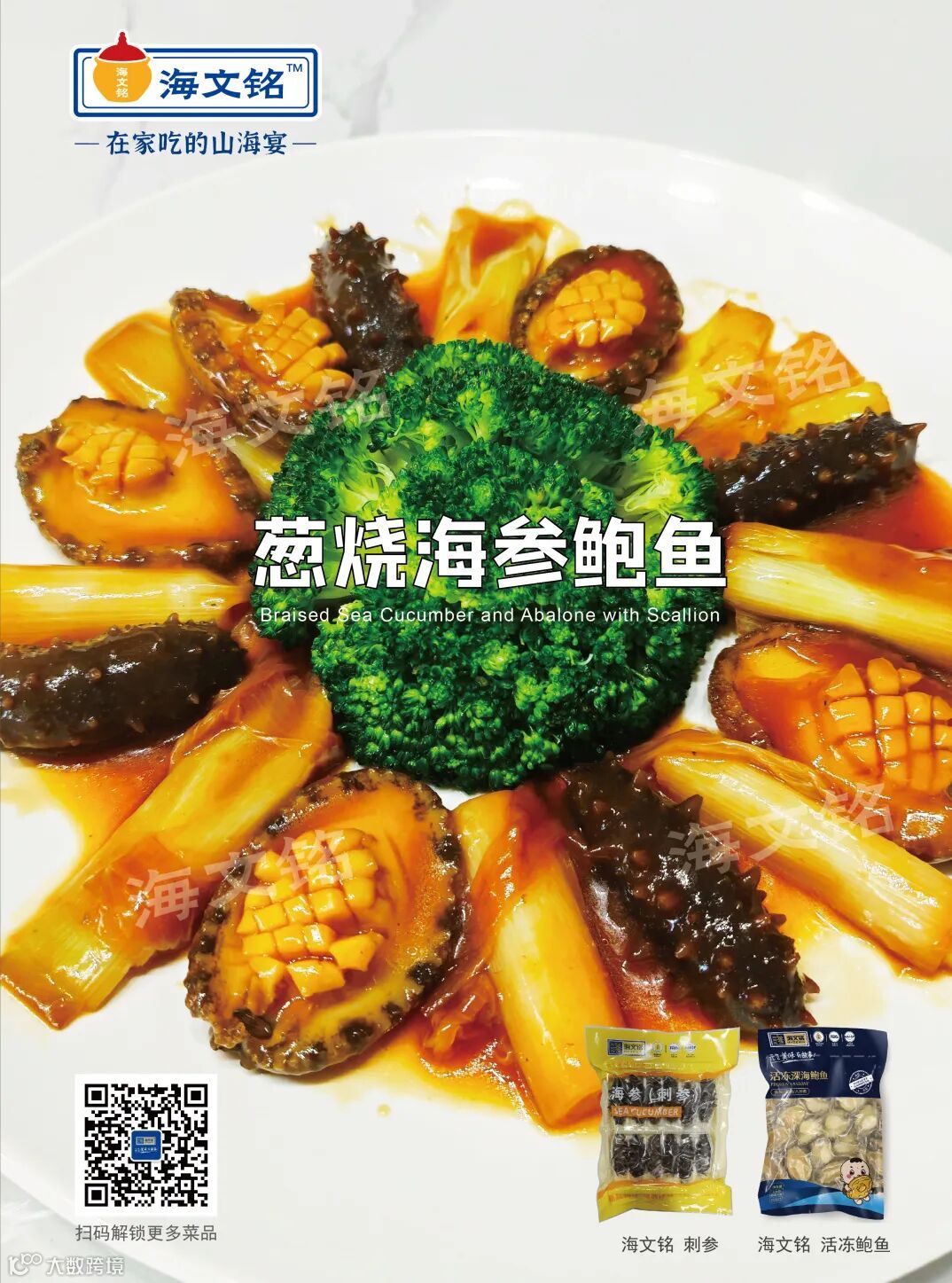 海文铭刺参、海文铭活冻鲍鱼、海文铭鲍鱼汁、京葱、西蓝花