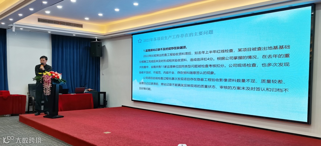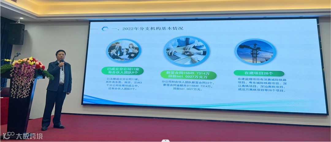 紧接着由公司副总经理、区域管理中心主任李志成汇报了分公司和合伙团队的监理等技术人员缺口较大、业务水平较薄弱的现状,他提出2023年主要“从生产经营管控、人员履约履职管理、日常办事效率、人员储备服务、廉洁从业监督管理”等方面进行提升。