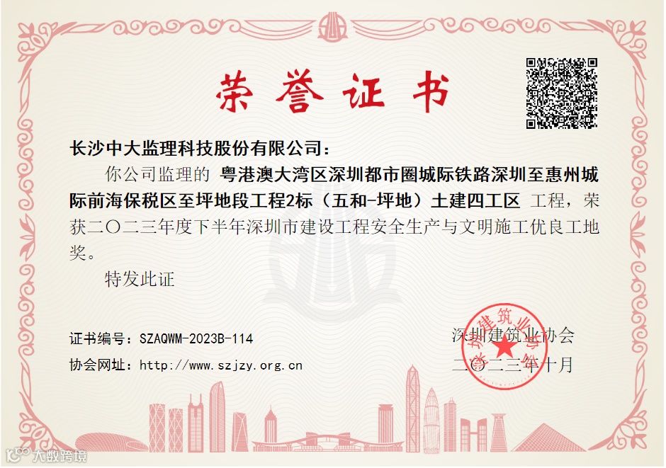 近期,由深圳市建筑业协会公布的“深圳市建设工程安全生产与文明施工优良评选”名单中,我公司参建的粤港澳大湾区深圳都市圈城际铁路深圳至惠州城际前海保税区至坪地段工程监理7标项目在此次评比中脱颖而出,荣获2023年度下半年深圳市建设工程安全生产与文明施工优良工地奖。