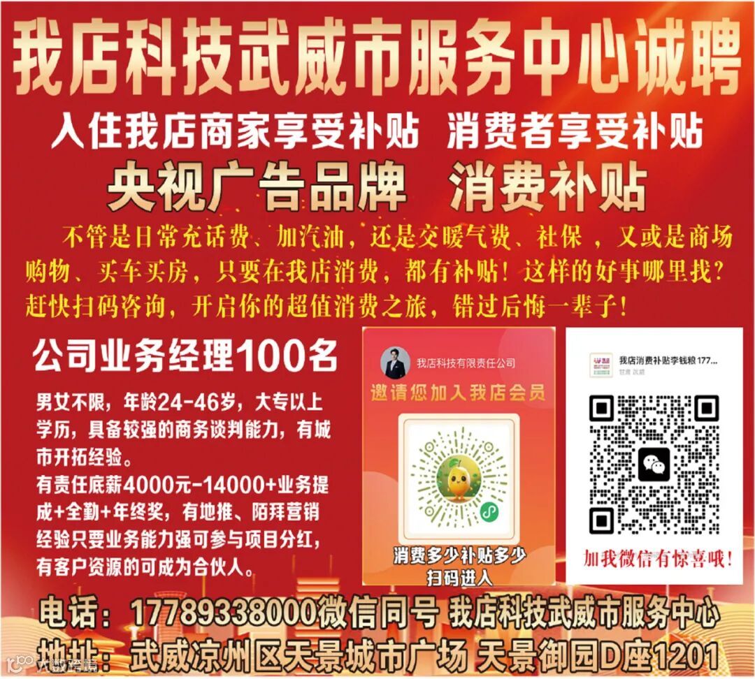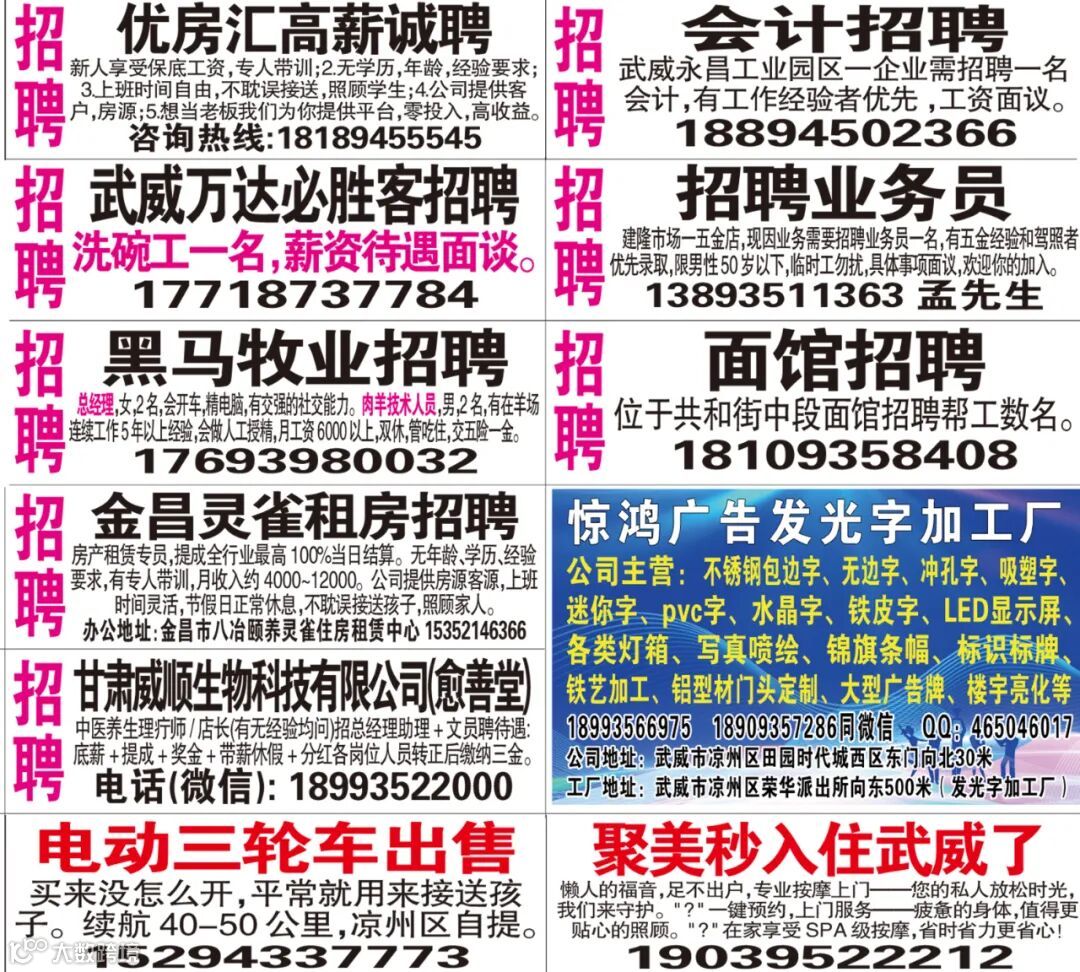 武威红柳广告和武威视觉传媒有限公司倾力打造武威本地网上生活平台,给您更好的本地资讯。招聘、求职、出租、转让、二手交易等便民信息查找、发布,商家优惠,吃喝玩乐购全都有。