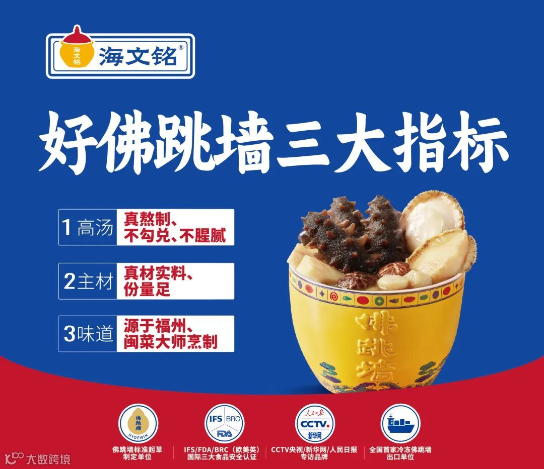 2013年,海文铭携手闽菜大师王德官师傅将传统佛跳墙进行产业化改良,经过团队十多年的研发,通过首条自主研发设计的冷冻佛跳墙生产线,先进的液氮超低温制冷技术,实现了佛跳墙产品标准化、规模化生产。海文铭佛跳墙将原来制作工艺繁琐,只能在高端酒店堂食的佛跳墙,制成方便美味的预制菜品,在还原佛跳墙的口味的同时,也迎合了大众的喜好。