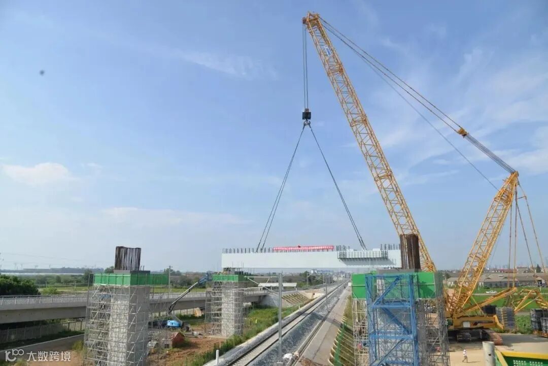 昌九高铁抚河特大桥上跨昌景黄铁路D2动走线共4跨钢横梁,首次吊装的钢横梁长34.4米,宽3.3米,高2.8米,吊装重量达217.6吨,采用徐工650T履带吊吊装。