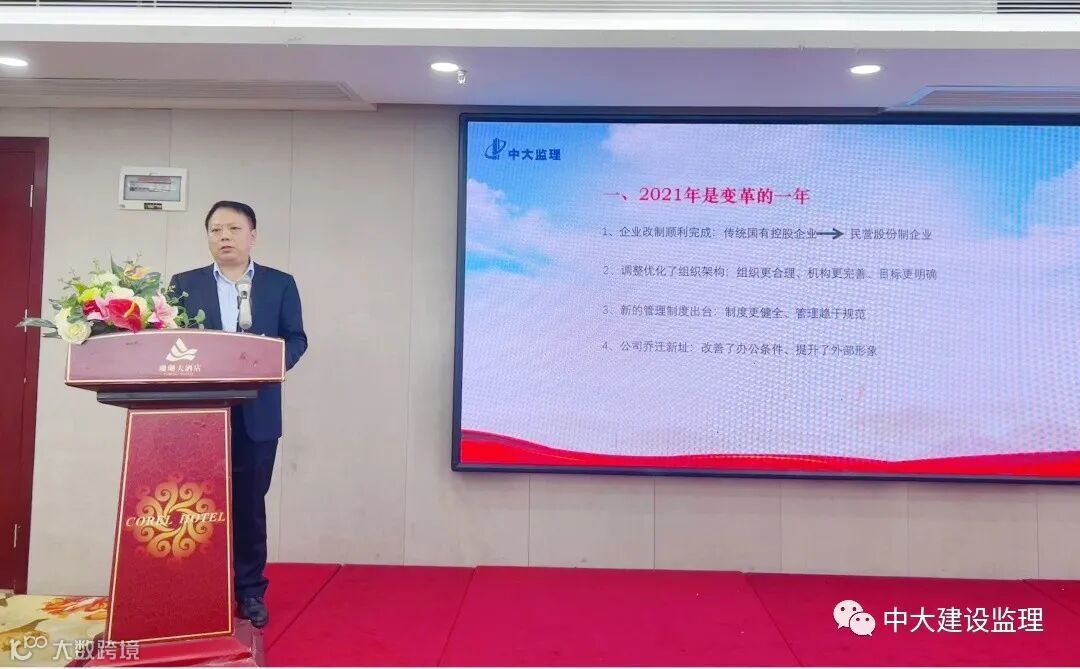 接下来是总经理王飞龙对公司经营工作进行了分享,明确了2022年经营目标对全面开创经营开发新局面充满信心,同时对各部门提出了工作要求,号召所有中大人都要迎头而上,精耕细作,以踏石留印、抓铁有痕的精神,紧咬目标,真抓实干,阔步前行。为实现幸福企业、成就幸福人生贡献自己的力量。