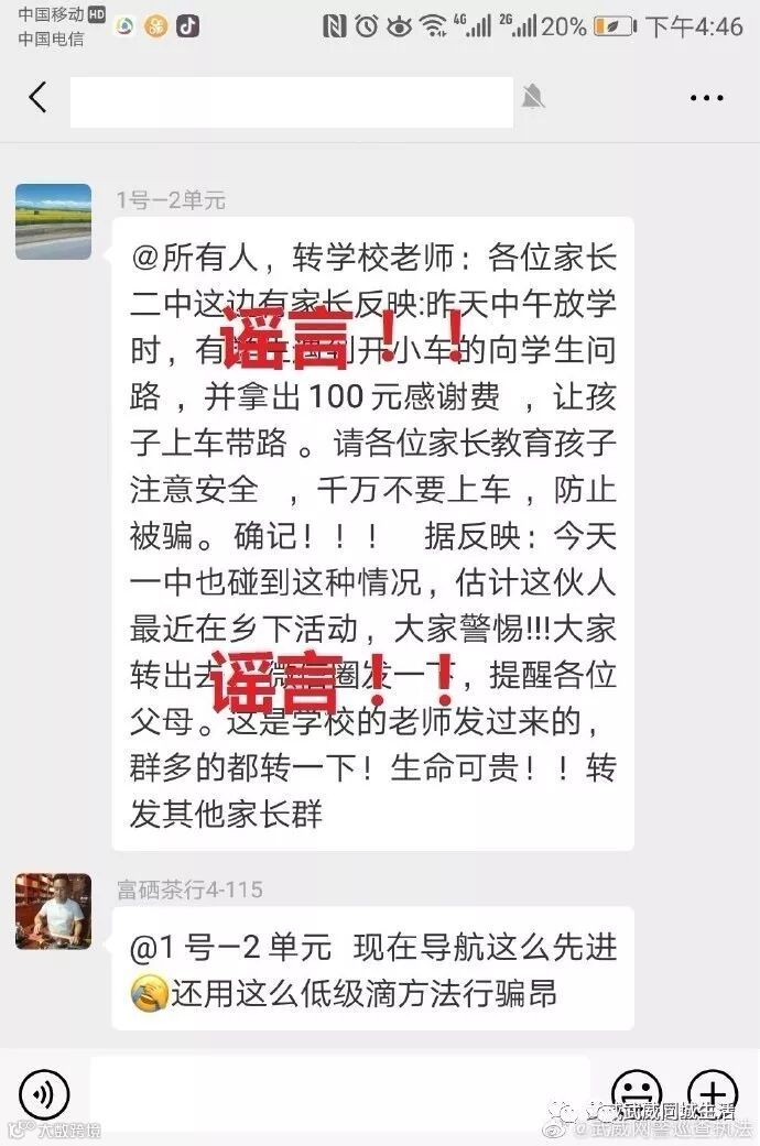 近日,武威市有群众反应,微信中流传着这样的信息“二中这边有家长反映:昨天中午放学时,有学生遇到开小车的向学生问路 ,并拿出100元感谢费 ,让孩子上车带路...... ”的信息。