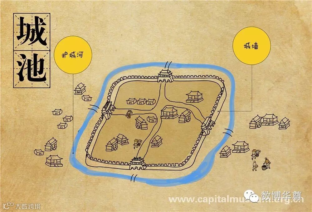 手绘漫画:城墙和护城河示意图