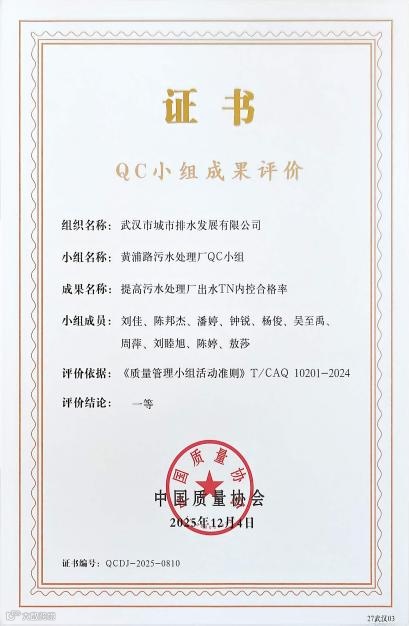 近日,2025年中国质量协会年会暨第三届追求卓越大会在北京隆重召开。作为全国质量管理领域的巅峰盛会,此次大会汇集各行各业132项优质QC成果同台竞技。经行业资深专家层层评审,武汉控股排水公司黄浦路污水处理厂申报的“提高污水处理厂出水 TN 内控合格率”项目,获评2025年度中国QC小组成果一等奖。