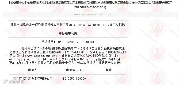 据了解,这也是武汉控股工程公司一年内第二次中标仙桃污水处理领域的项目。2024年12月,公司便凭借过硬专业实力中标仙桃市彭场郭河污水处理厂及配套管网提质增效更新工程。