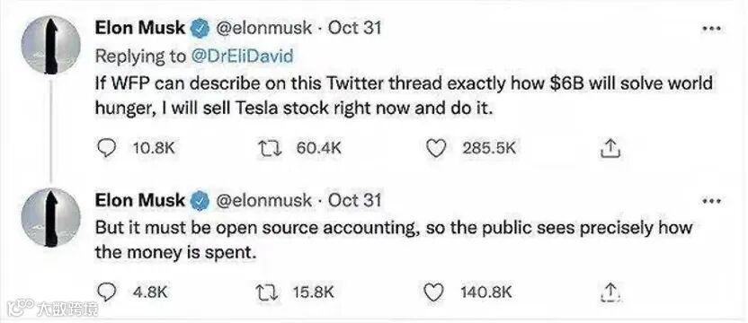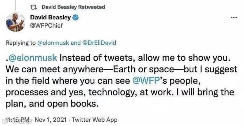 比斯利在推特上还写道,“与其在推特上交流,不如让我展示给你看。我们可以在任何地方见面——地球或者太空——但我建议在你能看见粮食计划署的员工、进展、当然还有技术的工作场所。我会把计划带来,打开账簿” 。