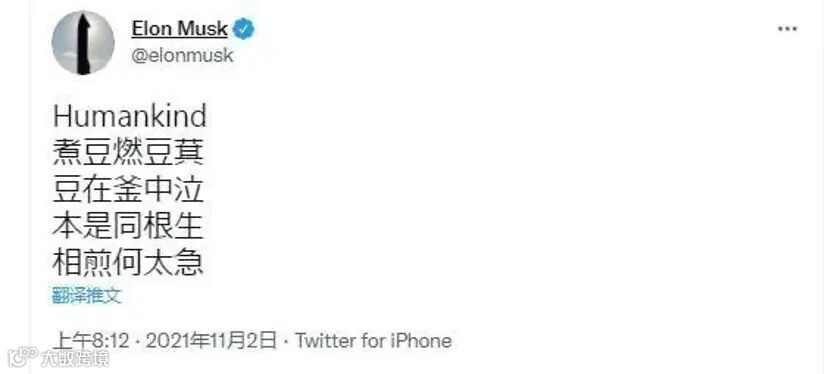 北京时间11月2日上午,“世界首富”、特斯拉CEO埃隆·马斯克(Elon Musk)在个人推特上发布了一首中文诗——曹植的《七步诗》。