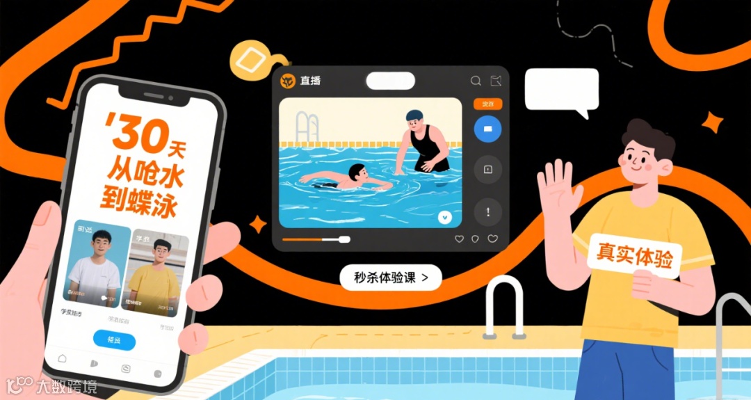 拍摄学员从“怕水到畅游”的成长对比,搭配悬念文案:“他用了30天,从呛水到蝶泳!你的蜕变只需一次体验课!”