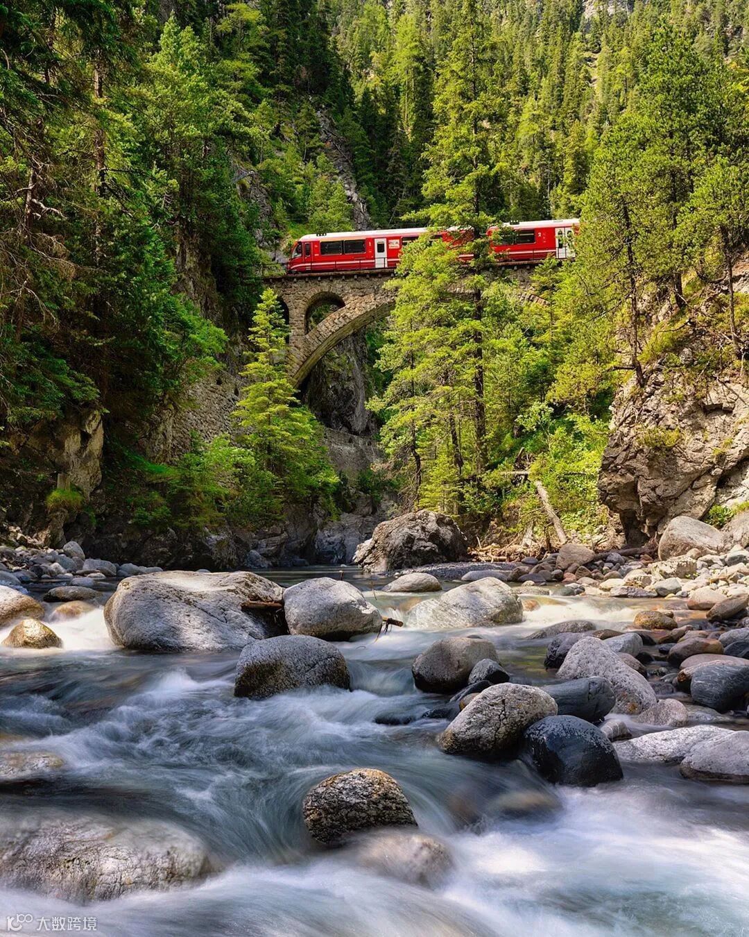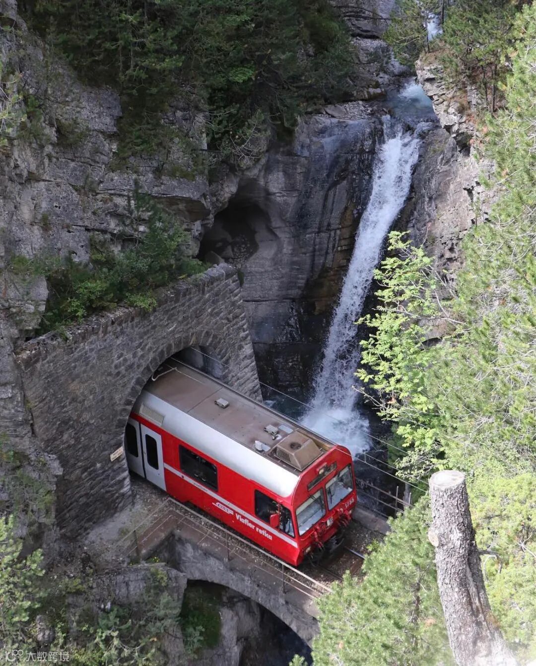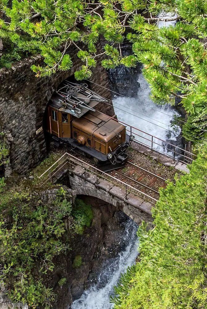 随着列车经过陡峭的楚根(Zügen)峡谷,翠绿的山林映入眼帘,清冽的瀑布近在咫尺……