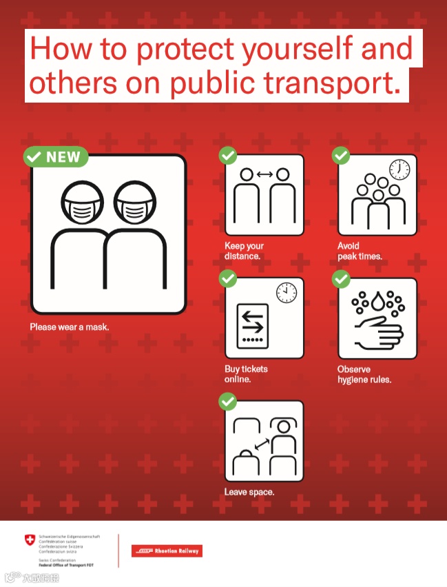 根据瑞士联邦公共卫生办公室(FOPH)的要求,12岁以上的乘客乘坐瑞士各地的公共交通工具时都必须佩戴口罩(开放式全景列车除外),但公共交通工具上仍然允许摘下口罩饮食。在火车站和商店的封闭区域也必须戴口罩,在火车站、车站的站台则无需佩戴口罩。