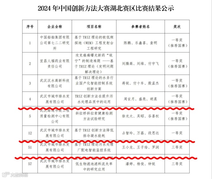 近日,从2024年中国创新方法大赛湖北赛区传来消息,经过大赛理论测试和项目展示2个环节的现场比拼,武汉控股旗下排水公司参赛团队均获奖,其中一等奖2项、三等奖2项。汤逊湖污水处理厂团队成功晋级国赛,取得参加2024年中国创新方法大赛全国总决赛的资格(全省共5个名额)。