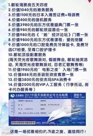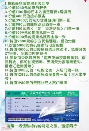 东方优雅号12月21-25号邮轮起航咯!这是一个2000人的高端圈层,百亿企业家与您近距离分享商战之道,800位优雅女性一起绽放精彩!不过我们要求有点高,不管男女,你需要带不同颜色的5套礼服,还可能被电影镜头拍,因为我们邮轮上有两部电影开机仪式,你有可能随时和明星同框!因为我们在寻找优雅家族,邀您共度2017年邮轮圣诞平安夜!