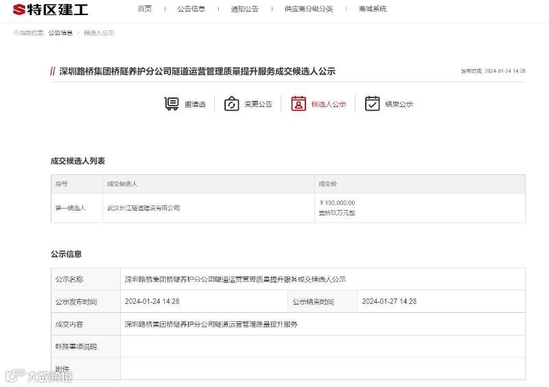 1月下旬,深圳市特区建工集团有限公司供应商投标平台公示,长江隧道公司成功中标深圳路桥集团桥隧养护分公司隧道运营管理质量提升服务项目,这是继承揽汕头海湾隧道运维管养和襄阳市东西轴线道路工程鱼梁洲段PPP项目运营专项管理咨询服务项目后,长江隧道公司再次勇创市场拓展佳绩。