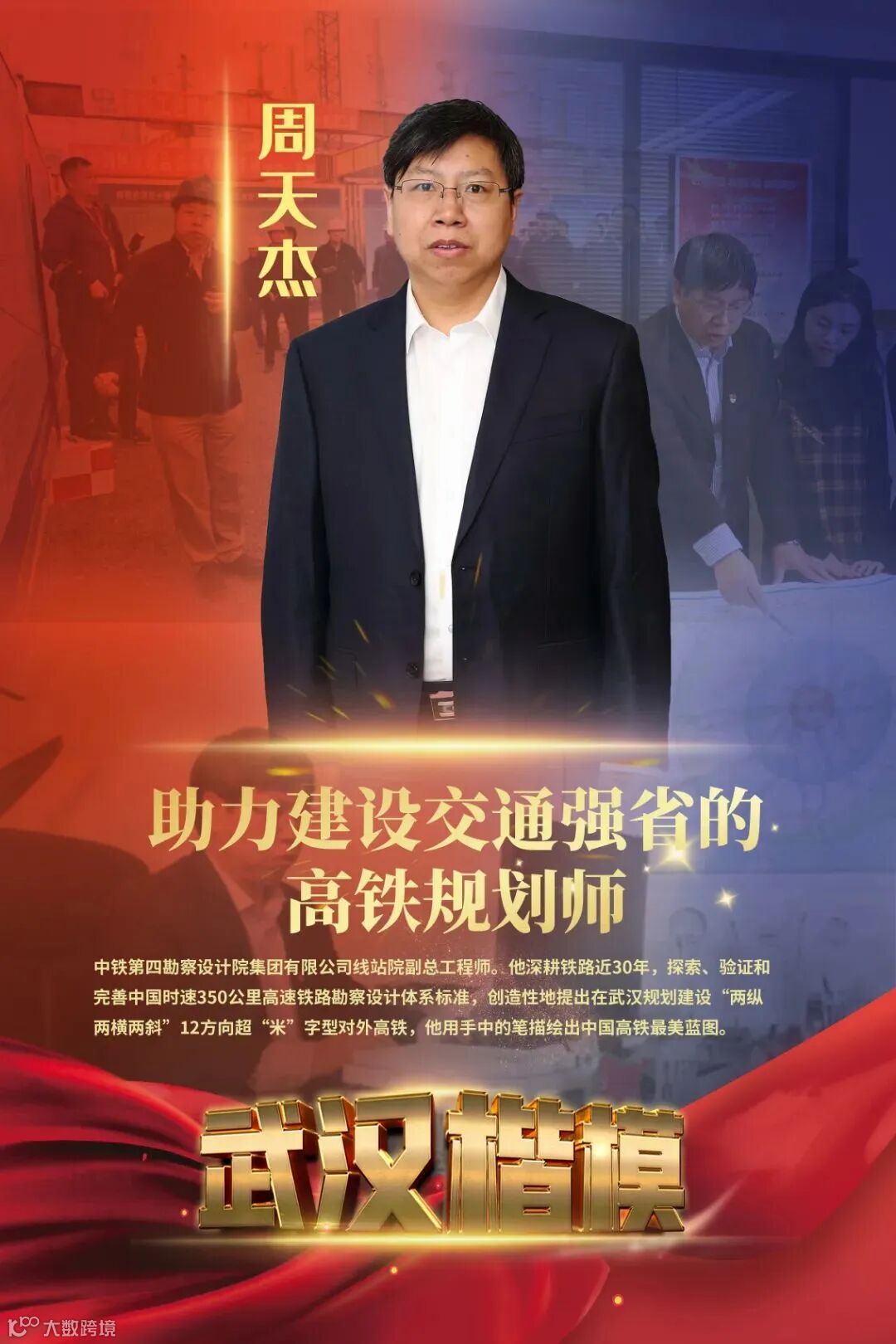 为把湖北打造成为长江经济带、中部崛起的现代化综合交通战略支点,周天杰创造性地提出在武汉规划建设“两纵两横两斜”12方向超“米”字型对外高铁,新增2处过长江铁路通道,按“五主三辅”布局的武汉客运系统总图规划调整方案,最终可实现武汉至省内城市群“0.5~1小时城际交通圈”,至邻近城市群“1~2小时高铁交通圈”,至全国其它主要城市群“3~5小时高铁交通圈”。里程碑式的路网构架、前瞻性的总图格局,不仅奠定了中国“高铁之心”、“祖国立交桥”的路网根基,也为武汉从建设国家中心城市、再到世界城市的宏伟发展打下了现代化交通的坚实基础,研究成果获省市领导和社会各界的高度赞扬。