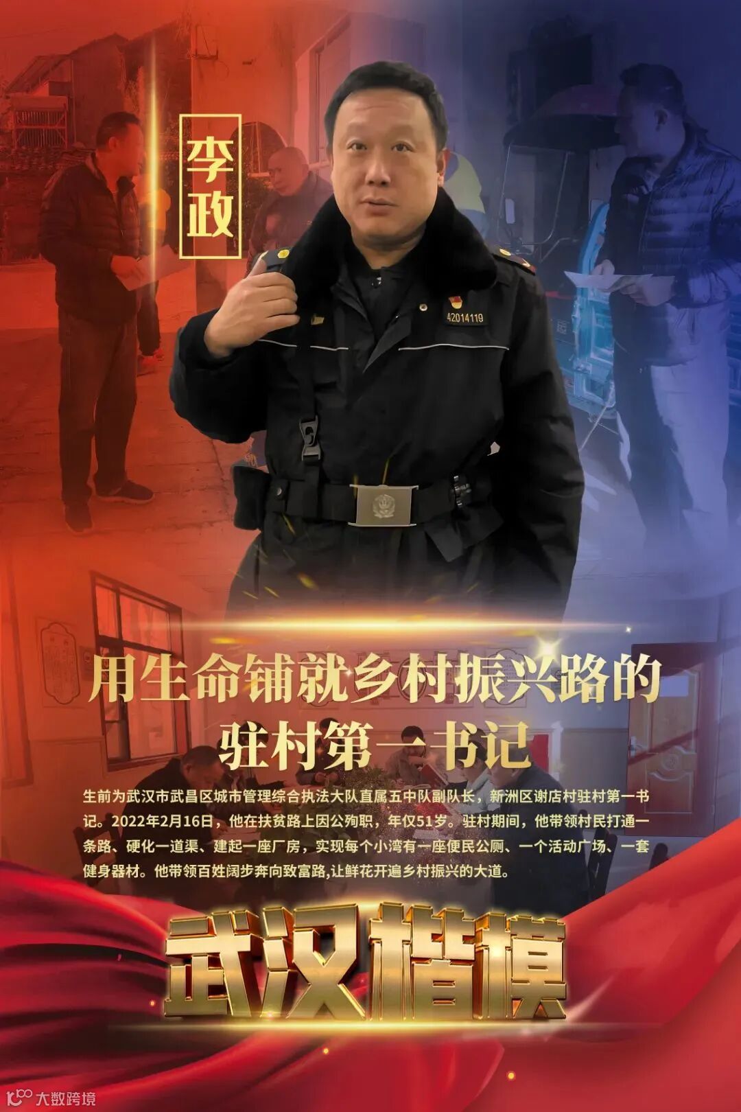 2021年8月,李政同志来到新洲区徐古街担任驻村第一书记。驻村正值疫情防控之时,他积极投入到疫情防控工作之中,组织村民接种新冠肺炎疫苗。9月,他正式驻扎谢店村。为吃透乡村振兴有关政策文件,他将文件资料做成小纸片,随身携带,随时翻阅。他冒着酷暑走访了万岗村、谢店村22户脱贫户,详细询问他们的家庭、生产生活、疾病医疗等情况,做到情况了然于胸,并在一些重要节日进行走访慰问。驻村期间,他不是在走村串户就是在田间地头查看情况。2021年底,为了村里的豆丝厂建设,他积极奔走联系设备资金,帮助豆丝厂顺利建起。他想方设法,帮助村里将1000米土渠硬化修缮,提高渠道水利作用。他带领村民打通村级公路通往茶园的乡村振兴路,并积极投入村湾环境整治,帮助村里修建了便民公厕、活动广场、健身器材等基础设施。半年间带领村民打通一条路、硬化一道渠、建起一座厂房。2022年2月16日,在工作岗位上因公不幸殉职,年仅51岁。