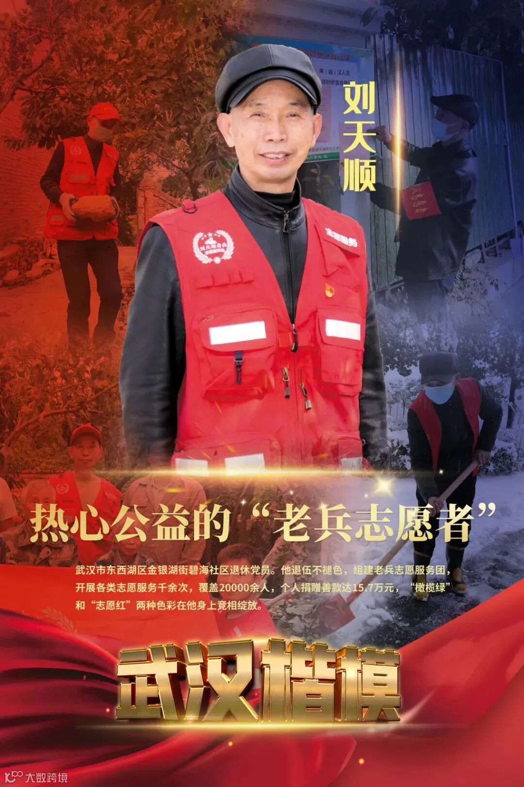 他曾参加对越自卫反击战,先后荣立三等功4次,二等功1次,曾荣获第四届武汉市文明市民。一朝戎装身,终生军旅情。一次志愿,终身志愿。“橄榄绿”和“志愿红”两种色彩在刘天顺身上竞相绽放。不同的角色,不同的使命,但为人民服务的初心永远不会改变。刘天顺始终保持着冲锋在前勇于担当的优良传统,依旧保持着为人民服务的本色,积极投身于社区治理的各项工作,成为社区发展治理中最亮的一抹“红”。