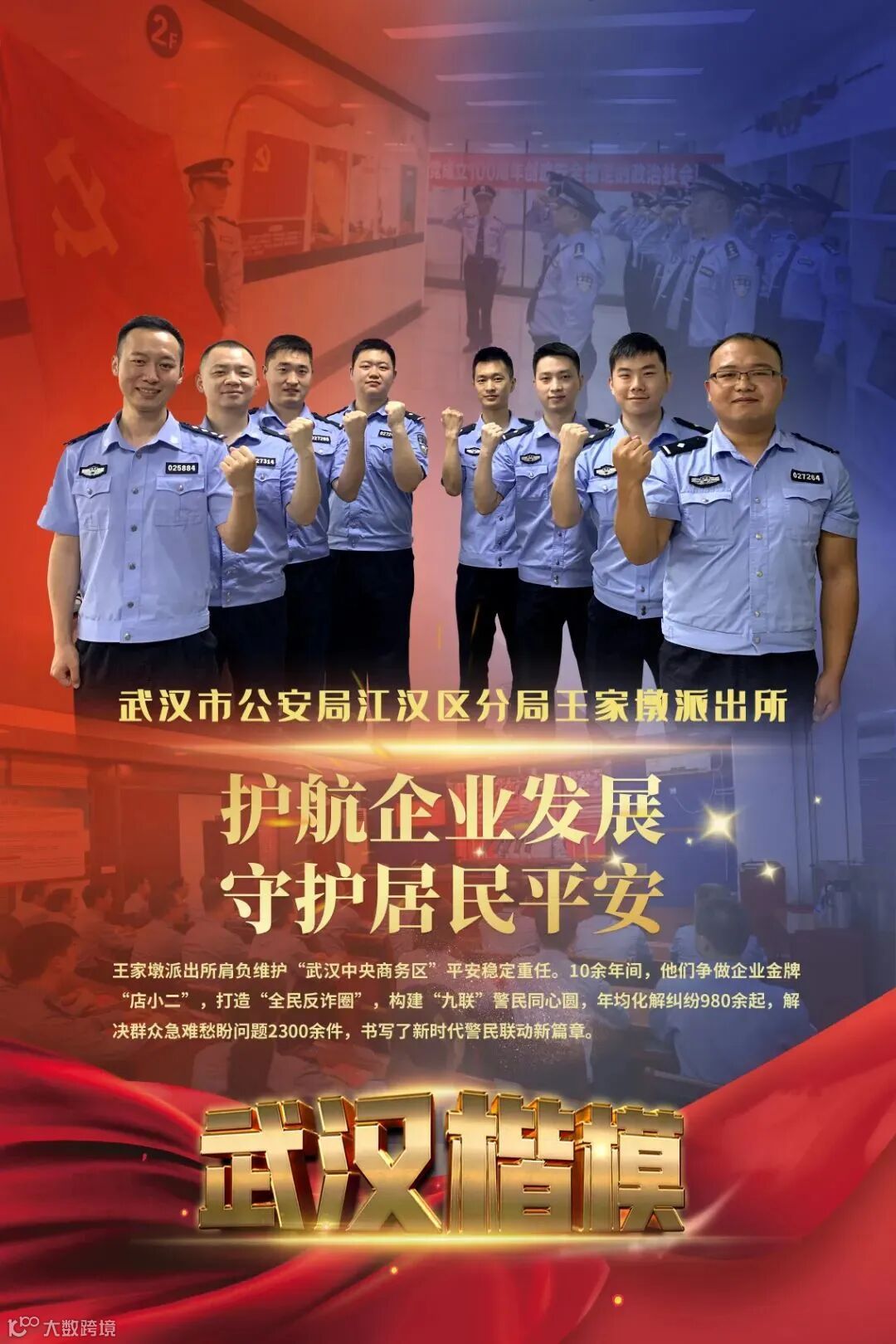 王家墩派出所辖区地处武汉市中心城区江汉区中部区域,2008年被市委、市政府确定为“武汉中央商务区”。10余年间,辖区经济飞速发展,治安情况迅猛变化。站在新的历史方位,王家墩派出所厚植服务理念,先后圆满完成多项重大安保任务。