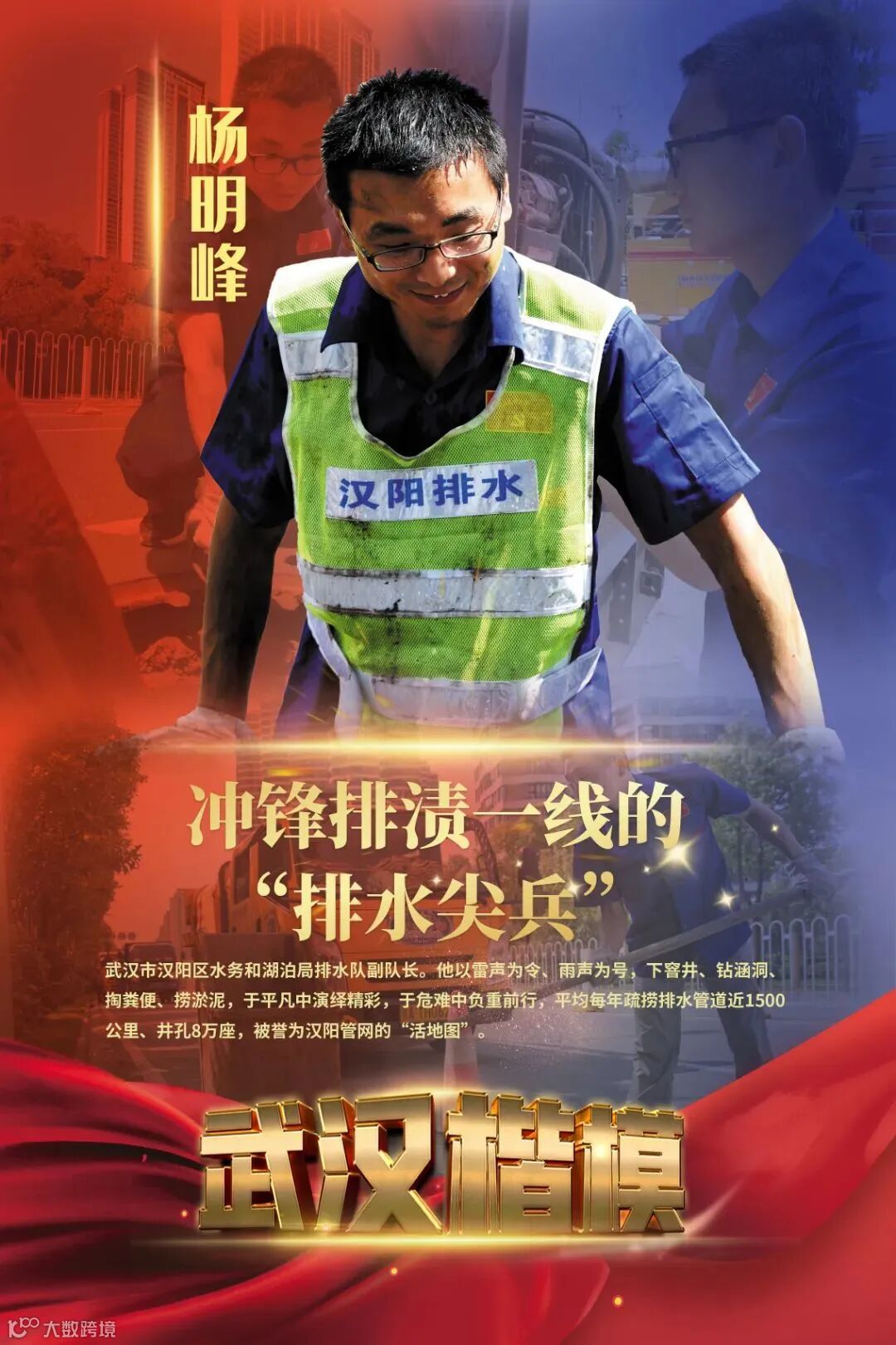 龙阳大道郭茨口江汉二桥下桥处一直以来是极易渍水的点位。如果遭受短时间强降雨,路面极易产生积水,这个地方车流量较大,一旦发生渍水很容易造成交通拥堵。2020年7月一个上午,一场暴雨来袭。在安排好各点位的值守人员工作后,杨明峰赶到现场与值守人员一同揭开路边井盖,畅通排水。为了避免揭开井盖的窨井成为危险因素,导致行人、车辆出现安全隐患,杨明峰主动站在窨井旁充当起“人肉标识”,引导车辆减速慢行,待设备抽排后将警示标志放置妥当,杨明峰再走向下一个窨井。这一站,就是整整十个小时……闷在胶套鞋里的双脚近乎没有知觉,腰酸背痛几乎直不起身子。但在他们的努力下,该处没有发生一起车辆抛锚和安全事故,周边社区居民正常出行。在长江武汉段超警戒水位的日子里,杨明峰和排水队员们严防死守、团结一心,确保了城市不内涝,人民群众生命安全不受损失。
