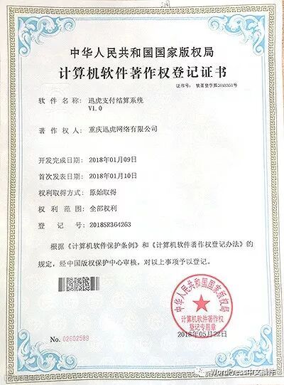 经中华人民共和国国家版权局考证,根据《中华人民共和国计算机软件保护条例》和《计算机软件著作权登记办法》的规定,重庆迅虎网络有限公司近日取得计算机软件著作权登记证书。
